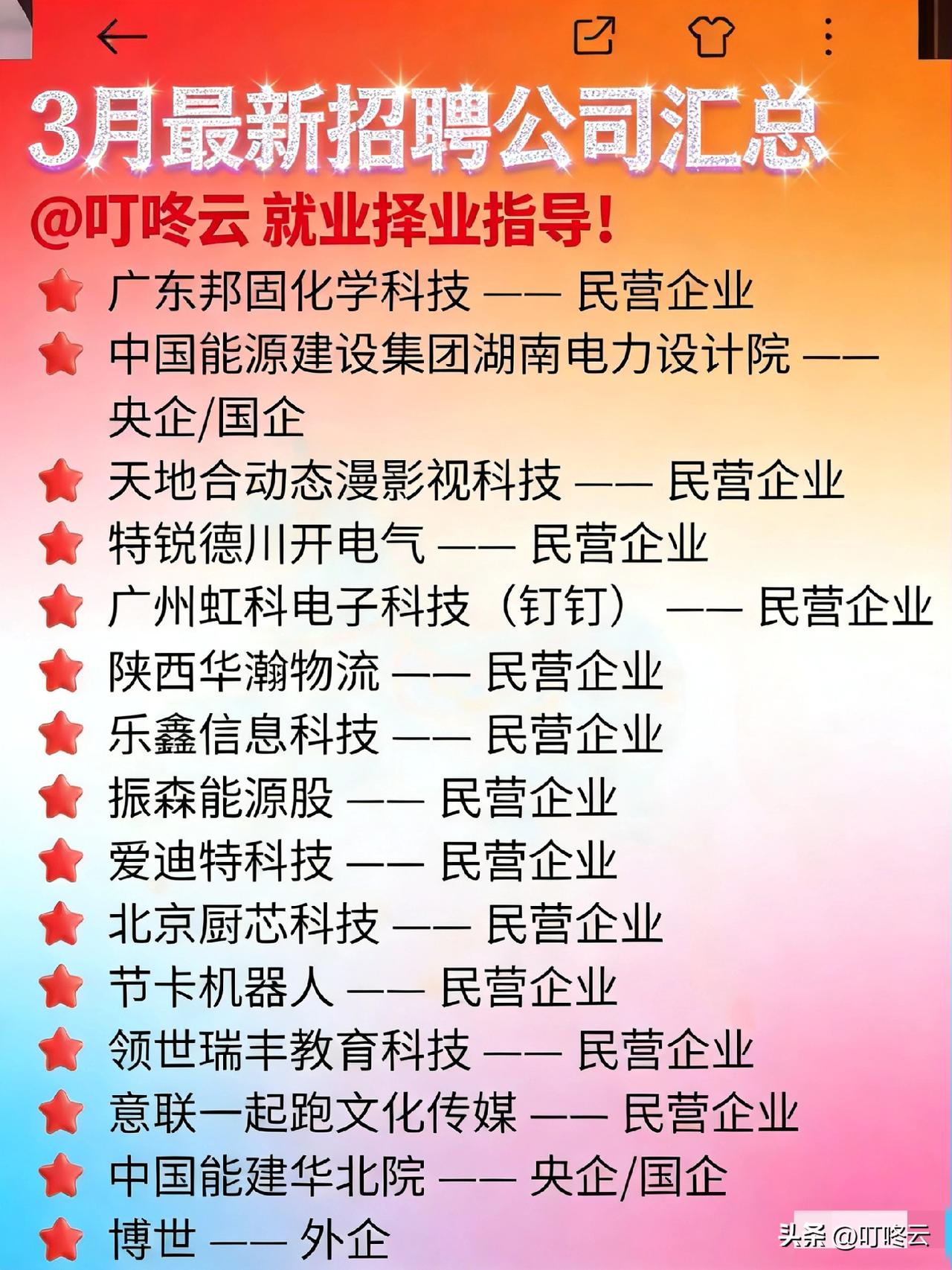 3月份40家头部企业招聘汇总合集!🚀 2026春招“捡漏”指南:3月企业池炸场,应届生别躺平![点亮平安灯][点亮平安灯][福][福] ✨ 家人们谁懂啊!从2月延续到3月的春招企业池,简直是应届生的“职场黄金矿场”!先盘数据:银行系占比超20%(温州、禾城、上海农商行等扎堆),国企/央企占比15%(联通、中国能建系),互联网/科技/制造类占比超40%(小鹏、拳头游戏、晋华集成电路等),外企/民企补位剩余份额,赛道多元到能让“天坑专业”都找到对口坑! 📊 对比2025春招数据:今年民企开放岗位同比涨30%,尤其是半导体(晋华集成)、新能源(小鹏汽车)、文娱(拳头游戏、华强方特)赛道,直接把“工科生/文科生就业难”的脸打肿!而银行系依旧是“稳定党天菜”,农商行+城商行的扩招,让财经类专业毕业生实现“offer自由”。 🎯 更狠的是:央企/外企(如联通、博世)的春招窗口期更长,堪称“补录神器”!对比往年春招“3月中旬截止”的节奏,今年不少企业把网申拉长到4月,给了“考研失利党”“考公落榜生”完美的“逆袭缓冲期”。 💡 别再当“信息差受害者”!@叮咚云 就业择业指导!从岗位匹配到简历优化,帮你精准锁定“性价比最高”的offer,让你在春招卷王大战中躺赢到最后! 欢迎关注@叮咚云 就业择业指导,帮你快速拿到offer!将优先为粉丝职业规划指导,为你定制最适合的就业择业方案!欢迎留言交流讨论。[来看我][来看我] 免责声明:图片来自网络,仅供参考
