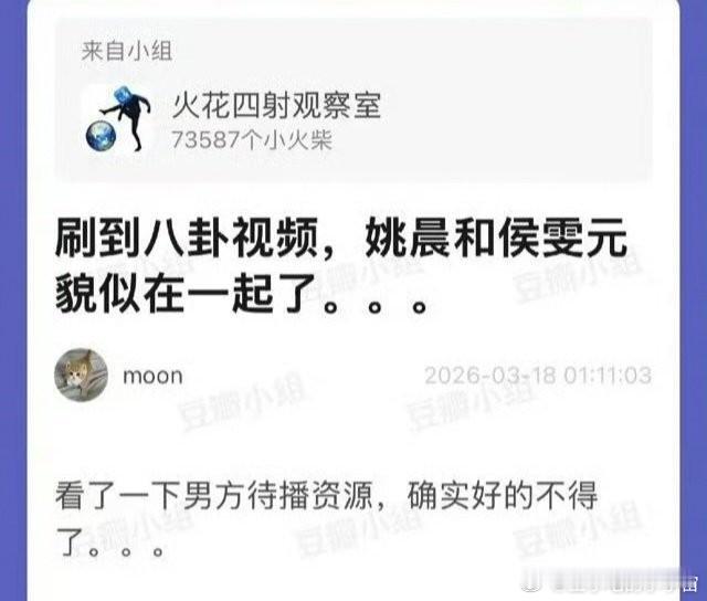 姚晨有新恋情了?男方辟谣是假的一名广西匿名网友评论称姚晨与侯雯元相恋,并指其“逼迫侯雯元与钟楚曦分手”。该爆料无任何图像、聊天记录或狗仔跟拍等实质证据,也未获三方当事人证实。姚晨这是官宣离婚不到24小时,就被曝与小11岁侯雯元因戏生情,合作《以美之名》朝夕相处,片场正常互动,无实锤全靠网传,你觉得真的假的,侯雯元方辟谣:是假的