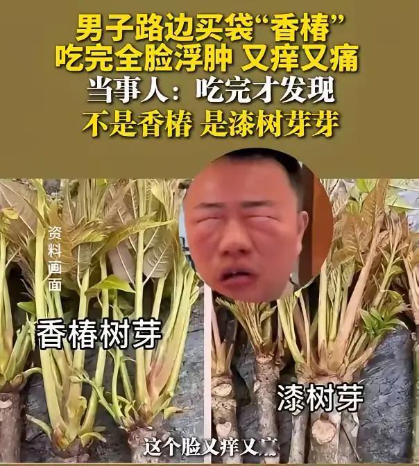 太惨了!海南三亚,男子在路边看到有阿姨摆摊卖香椿,就直接买了一袋回家吃,不料,吃完后却浑身又痛又痒,脸都红成了“猴屁股”,他这才知道,吃的根本不是香椿,而是漆树芽芽。 男子回忆,当时看着那堆嫩芽绿得鲜亮,和平时菜市场见的香椿模样差不多,阿姨喊着“新鲜头茬香椿”,他没多想就拎了一袋。回家焯水、爆炒,端上桌还跟家人夸这野菜香,结果饭还没吃完,嘴唇就开始发麻,紧接着整张脸像被火烧一样发烫,眼睛肿得只剩一条缝,连抬手都觉得皮肤刺痛。他慌里慌张冲到医院,医生一看症状就直摇头,说这是典型的漆树过敏,再晚来一步可能连呼吸都要受影响。 看着对比图才发现,香椿和漆树芽的区别藏在细节里。香椿的叶片边缘有锯齿,闻起来是清冽的草木香,而漆树芽的叶片更光滑,凑近闻还有点刺鼻的怪味。可偏偏就是这些容易被忽略的小差别,让不少人栽了跟头。更让人揪心的是,卖菜的阿姨未必是故意使坏,可能她自己也分不清这两种野菜,毕竟在山野里,长得像的野菜太多了,老一辈凭经验认菜的法子,放到快节奏的城市里,很容易就走了样。 这事看着滑稽,实则戳中了我们生活里的一个盲区:我们总习惯用“长得像”“听着像”来判断事物,却懒得花一分钟去较真。路边摊的野菜、网红店的美食、朋友圈的偏方,我们凭着直觉和信任就往嘴里送,却忘了有些“相似”背后藏着要命的风险。就像这袋漆树芽,它披着香椿的外衣,骗过了眼睛,也骗过了我们对“天然野菜”的盲目信任。 每年春天都有人因为乱采乱吃野菜进医院。有人把毒芹当水芹,有人把曼陀罗当野菜,还有人跟他一样,把漆树芽、苍耳芽这些有毒的嫩芽,错当成能吃的香椿、刺老芽。大家总觉得野生的菜更香更鲜,想着“老一辈都这么吃”,就凭着模糊的印象往篮子里薅,完全没意识到,有些野菜跟毒草长得几乎一模一样,差一点就是要命的区别。 各位读者你们怎么看?欢迎在评论区讨论。