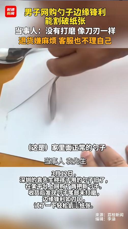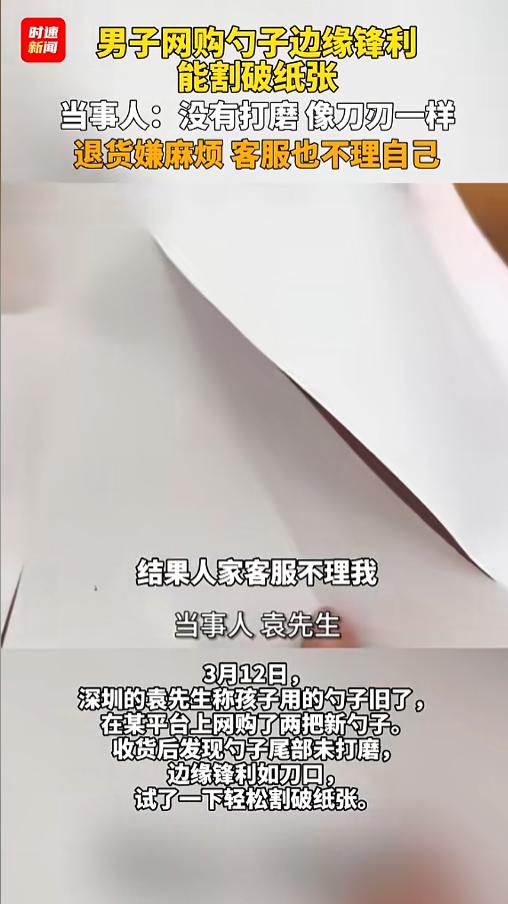 “细思极恐!”近日,广东深圳,一男子在网上购买了两把勺子,价格也不贵。收到货后,他发现勺子的边缘摸起来跟刀口一样,就找张纸试了一下,果然很容易就划出一道裂口。他去跟客服联系,竟然没人理他,退货也不值当。网友:真是便宜没好货啊! 网购让大家体会到了便利,小手一动,过几天货就送到家了,拆快递都能手软。就是网上的商品质量参差不齐,拆开之前,谁也不知道货是什么样子。 据媒体3月13日报道,袁先生看到孩子现在用的比较旧了,便想着重新再买几把勺子,这时候,正好有平台给他推了广告,他看着还行,价格也不贵,就网购两把。 收到货后,袁先生发现勺子质量不咋地,边缘的位置没有好好打磨,摸上去像刀口一样锋利。他找来张纸试了试,很容易就划出了几道口子,断面还很整齐。 袁先生又找出了家里正常的勺子,果然,自家的勺子边缘就比较圆润,没办法把纸张划开。 他觉得这勺子用起来会比较危险,可是10块钱两把,退货又不值当的,就联系了客服,想着跟客服说一下这个情况。谁知道,客服理都没理他。无奈之下,袁先生拍视频发到了网上,希望能给大家避一避雷。 网友看后表示,这勺子当小刀用倒是可以,但是当勺子朝嘴里放就太危险了,尤其是小孩子,这一不注意非得把嘴里划破不可。虽然他卖的便宜,可这勺子本身的成本就不高,这样明显隐患的部位怎么不好好处理一下呢? 信息来源:《男子网购勺子边缘锋利能割破纸张,当事人:没有打磨,像刀刃一样,退货嫌麻烦,客服也不理自己。》时速新闻