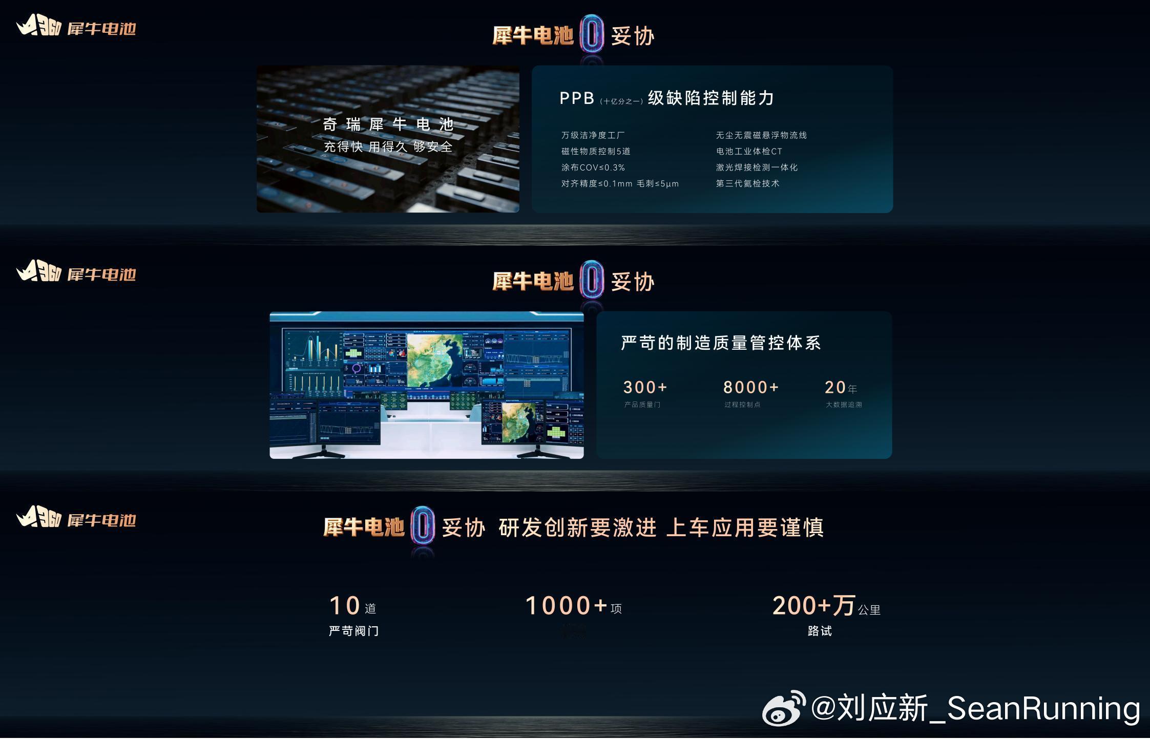 今晚,奇瑞汽车电池之夜,犀牛电池首次发布360°安全体系,三大安全防线分别是:犀晶以超国标材料从源头把控安全;犀盾凭借千度防火与毫秒断电技术,筑牢被动安全壁垒;犀云7×24小时智能云端控温,实现主动守护。高温、高寒、高盐、碰撞、刮底、涉水六大场景测试全部超越国标之上,十亿分之一级缺陷控制能力制造体系,让安全零妥协。奇瑞犀牛电池360度安全防护奇瑞要做真正的新能源车