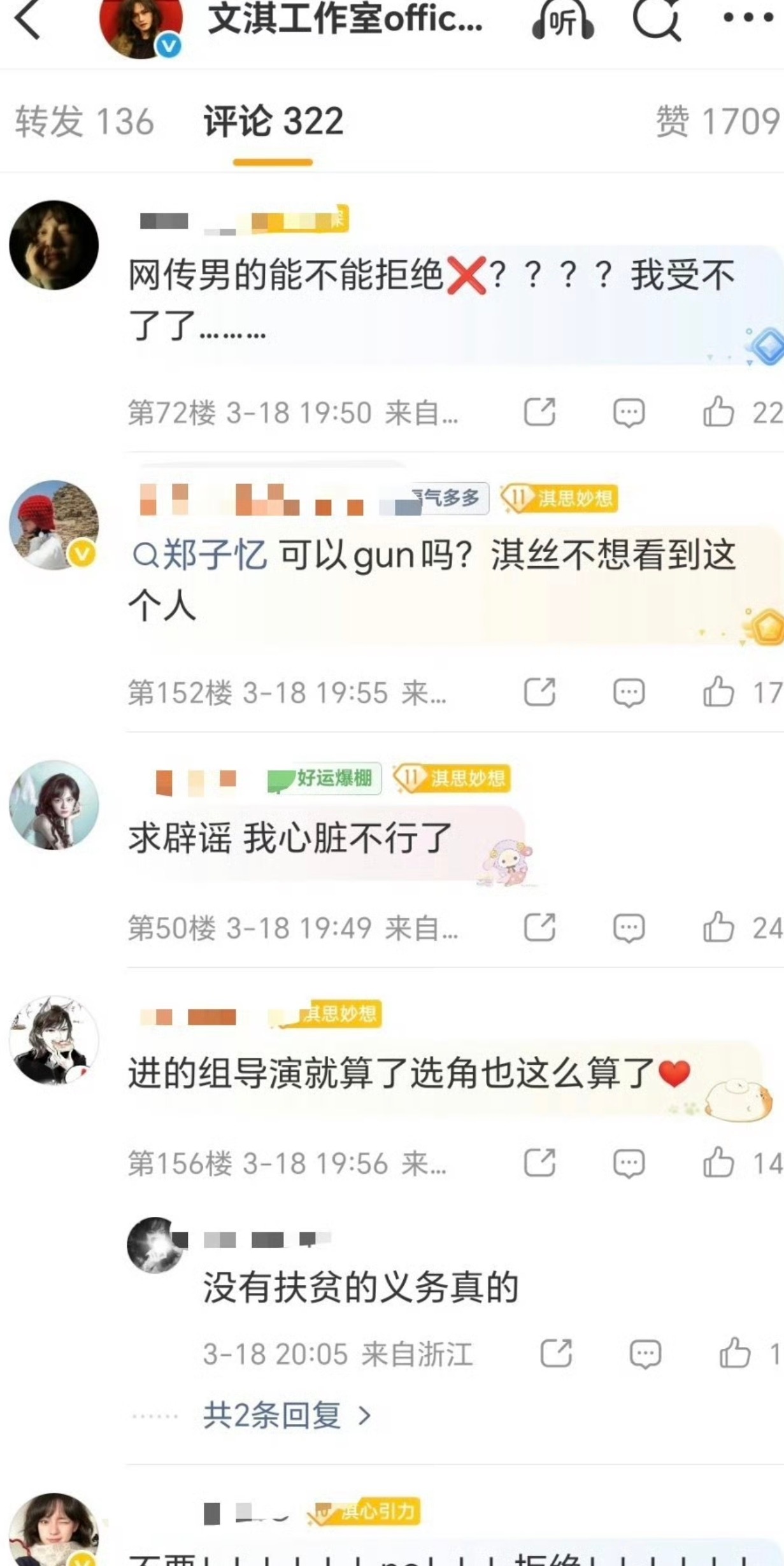 文淇粉丝在工作室评论区维权了拒绝和周柯宇合作