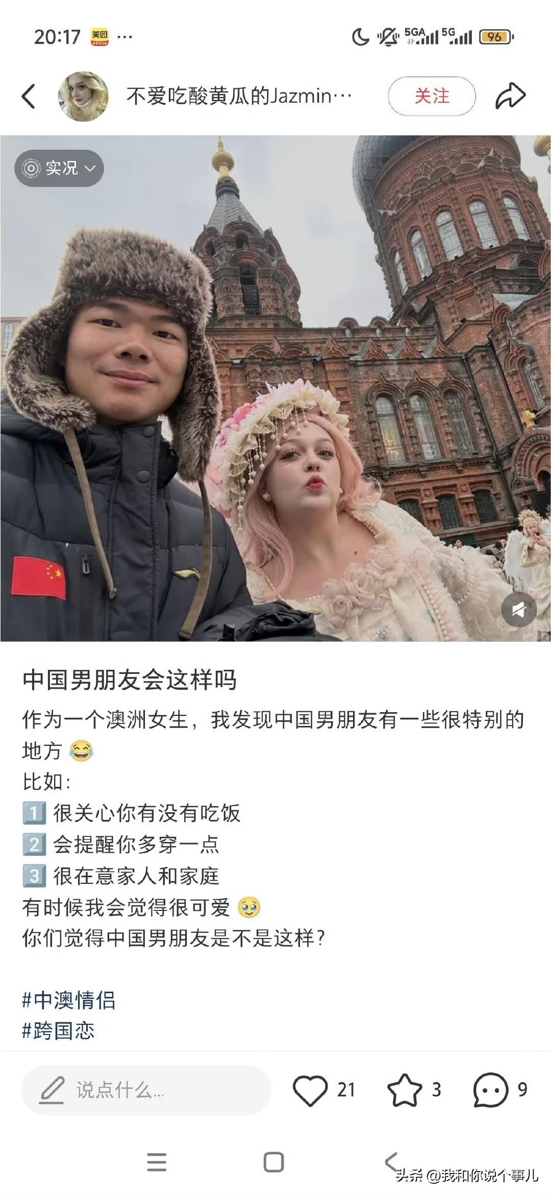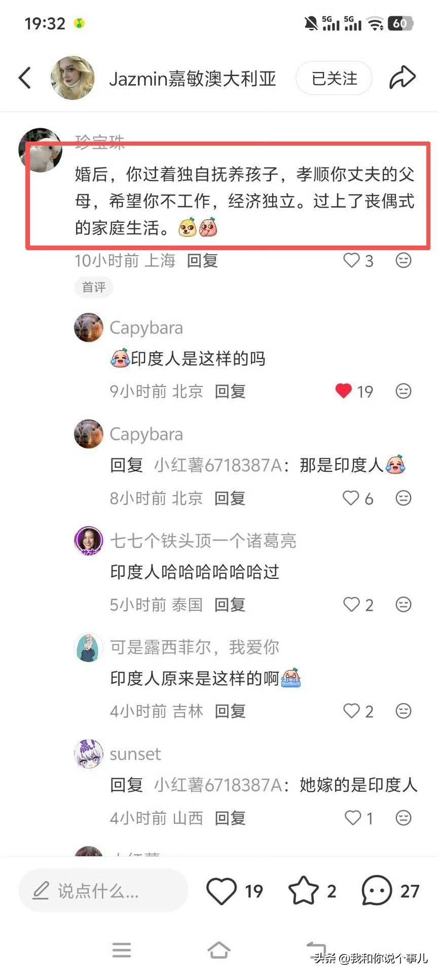 一位澳大利亚女网友晒出自己的中国男朋友的种种优点,然后下面一个国女阴阳怪气说: 婚后,你过着独自抚养孩子,孝顺你丈夫的父母,希望你不工作,经济独立。过上了丧偶式的家庭生活。 听听这都是啥乱七八糟的,嘴巴咋这么毒呢,结果打开这个人的个人简介后,发现这女的竟然嫁给了印度阿三…… 原本只以为她是鸡肠小肚。再想想,可能是天生嫉妒。没想到……是嫁给印度~ 啊……嫁给阿三确实会是像她说的这样,自己长相半斤八两过得不好不如意,所以对澳洲美女找中国男性谈恋爱怀有巨大恶意,只有臆想别人过着不幸的婚姻生活 有时幸福是对比出来的,选印度就很难绷,包括嫁黑人到非洲站街的,就像中邪了 带定位晒今日生活 我的今日状态:😁轻松愉快 我这里的天气:☀️晴天