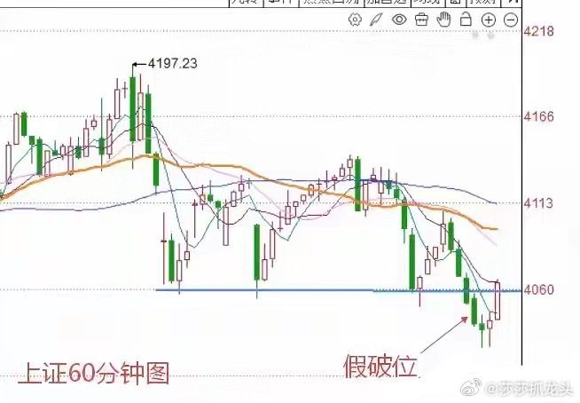 第一,从图一上证指数60分钟K线图来看,60分钟级别出现了假破位的信号。因为我们看到60分钟级别,市场指数今天盘中跌破了60分钟级别前期低点。但是收盘的时候又回到了前期低点的上方。这就构成了一个假破位。而且一旦假破位出现,往往意味着指数接下来将会有一个小幅反弹的行情, 甚至是反转行情。