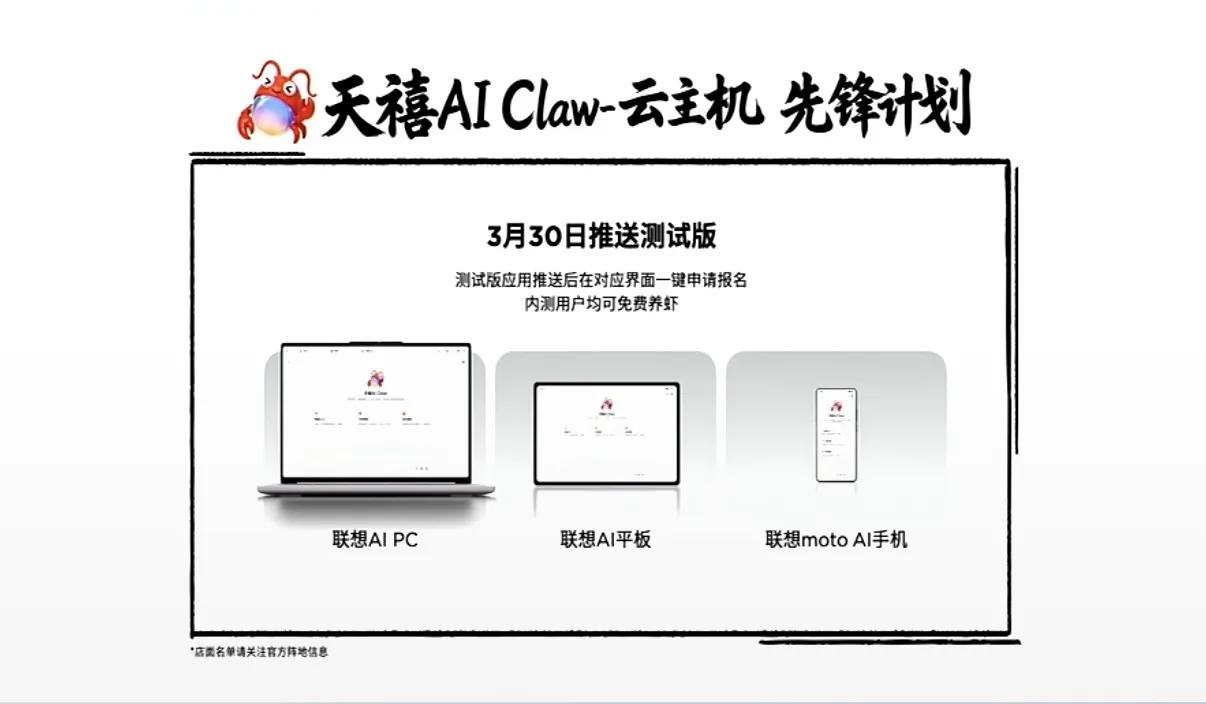 好家伙,联想也可以养龙虾了,天禧AI Claw正式发布 实现零成本部署 零门槛使用 在联想消费春季新品品鉴会上,理想天禧AI正式推出了天禧AI Claw。用户不需要自己搭环境,不需要反复配参数,也不需要把自己训练成半个专家才能开始使用AI,打开天禧AI Claw,它即可开始提供帮助。 同时天禧AI Claw将PC、手机等多端打通,跨设备协同,在端云混合架构的支持下,任务可以7×24小时地持续流转,持续接力、持续执行。天禧AI Claw基于独立的云主机运行,结合数据安全的隔离,可让执行环境更加清晰,权限边界更加明确,过程更可控,风险更可管理。 不仅如此,此次品鉴会初次亮相的联想小新Pro 13,是行业首款支持端侧一键部署OpenClaw的AI平板,拥有一键部署及学习场景定制Skill多项核心优势,为用户带来更加便捷、安全的使用体验,将在3月30号推出天禧AI Claw云主机的测试版本的先锋计划,内测用户均可免费“养虾”。联想推出天禧AI Claw