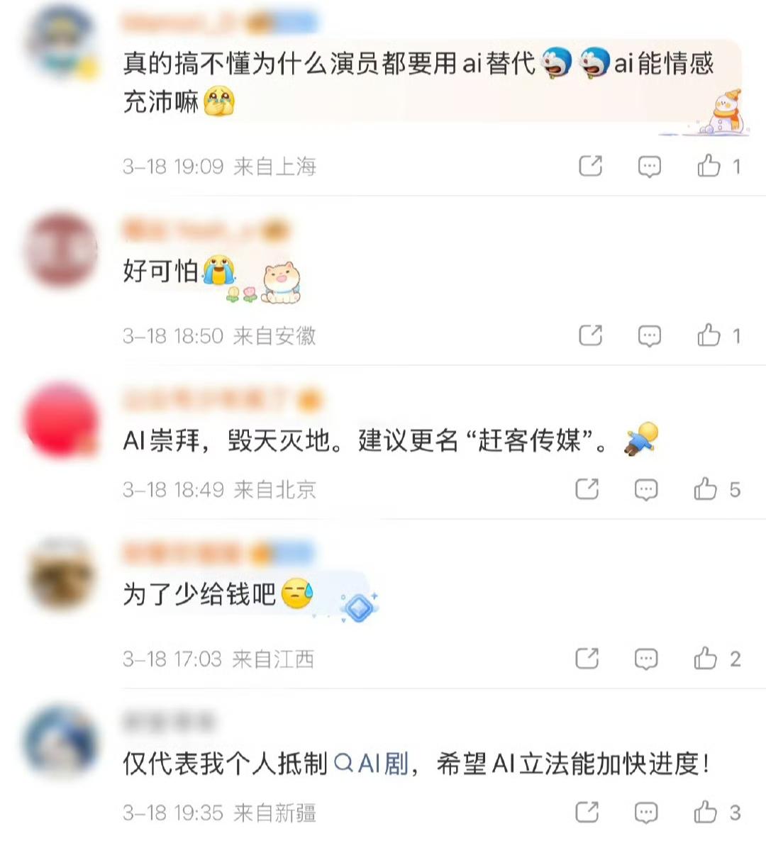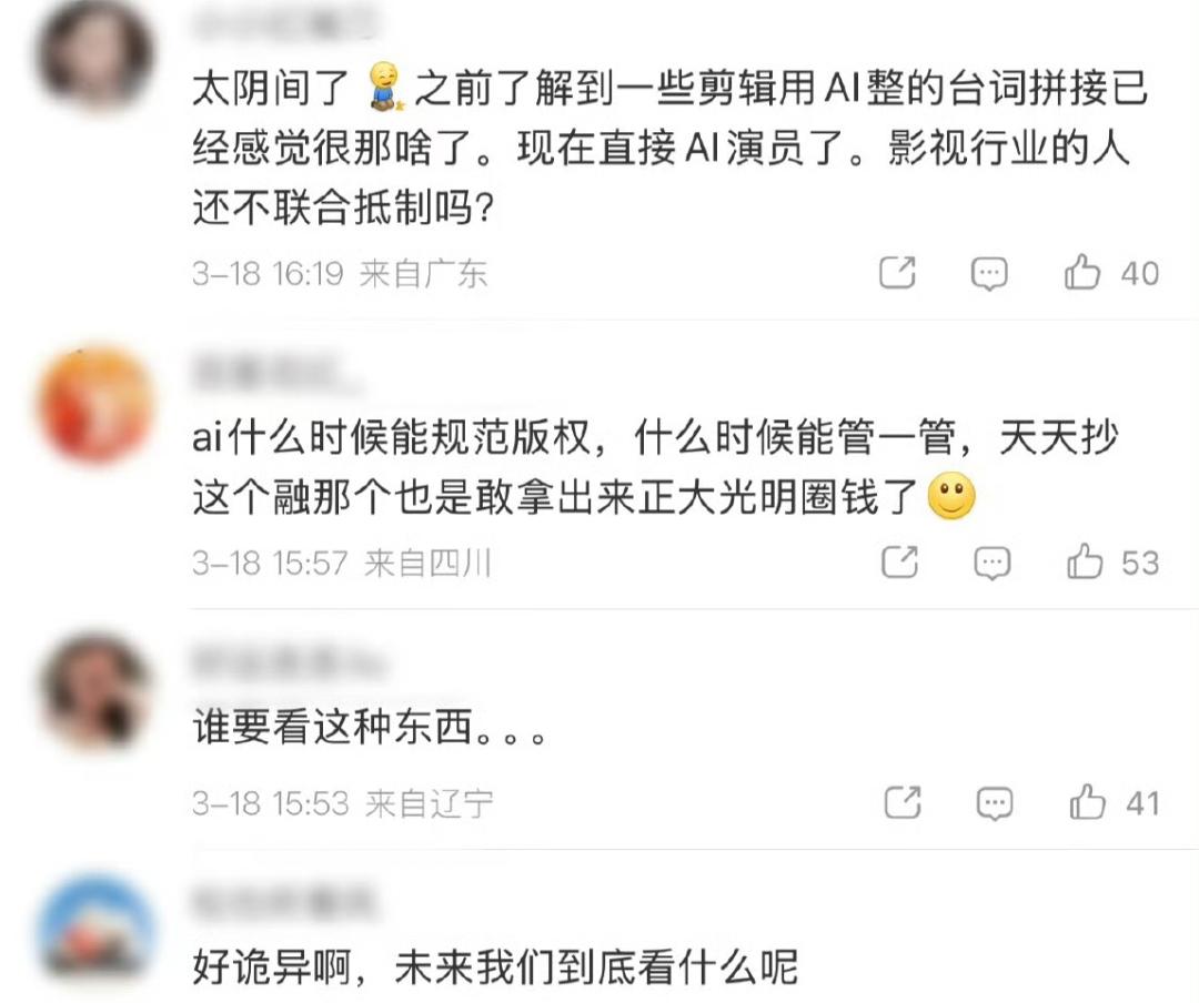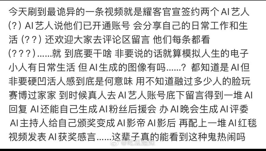 除了便宜,我实在想不出AI演员有哪点好。 表情和动作诡异不说,就是演技方面也是,根本没有意义。 以前老戏骨一颦一笑都带着伏笔。 AI演员有啥。 你要说AI帮忙写剧本就算了。 合着现在连演员都要搞AI替代了是吧? 好好的真人演员不用,非要捧两个算法捏出来的数字人,还一本正经说要分享日常、每条评论都看。 一个连实体都没有的代码,哪来的日常啊?硬凹活人感的样子真的又诡异又离谱! 更别说谁知道这张所谓的“AI脸”,融了多少真人演员的素材?连脸都是偷来的,也好意思说打破创作边界? 我举双手赞成全网抵制AI演员!我们要看的是有血有肉的演员,是带着真情实感的表演。 不是什么完美无缺的电子木乃伊! 有瑕疵的真心永远比冰冷的算法动人,