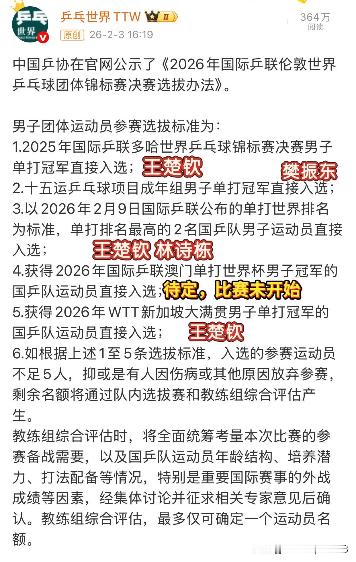 周启豪获得伦敦世乒赛参赛资格,王楚钦,林诗栋,周启豪确认参赛。 这一次队内赛鹏哥拦住了狗哥,向鹏战胜了第一阶段晋级的徐瑛彬。 根据伦敦世乒赛选拔标准,王楚钦,樊振东,林诗栋获得参赛资格, 今天刚刚结束的队内选拔赛,周启豪3-1战胜温瑞博,拿到了伦敦世乒赛的参赛资格。 伦敦世乒赛团体赛共5人参赛, 如果樊振东确认参赛,那就还有一个名额待定,要么是澳门世界杯的冠军,要么是教练组通过综合评估确定这个名额。 如果樊振东不参赛,那就还有两个名额待定,澳门世界杯冠军一个(如果有的话), 如果没有,那就其中一个还是要通过队内赛来确定,另外一个教练组综合评估。