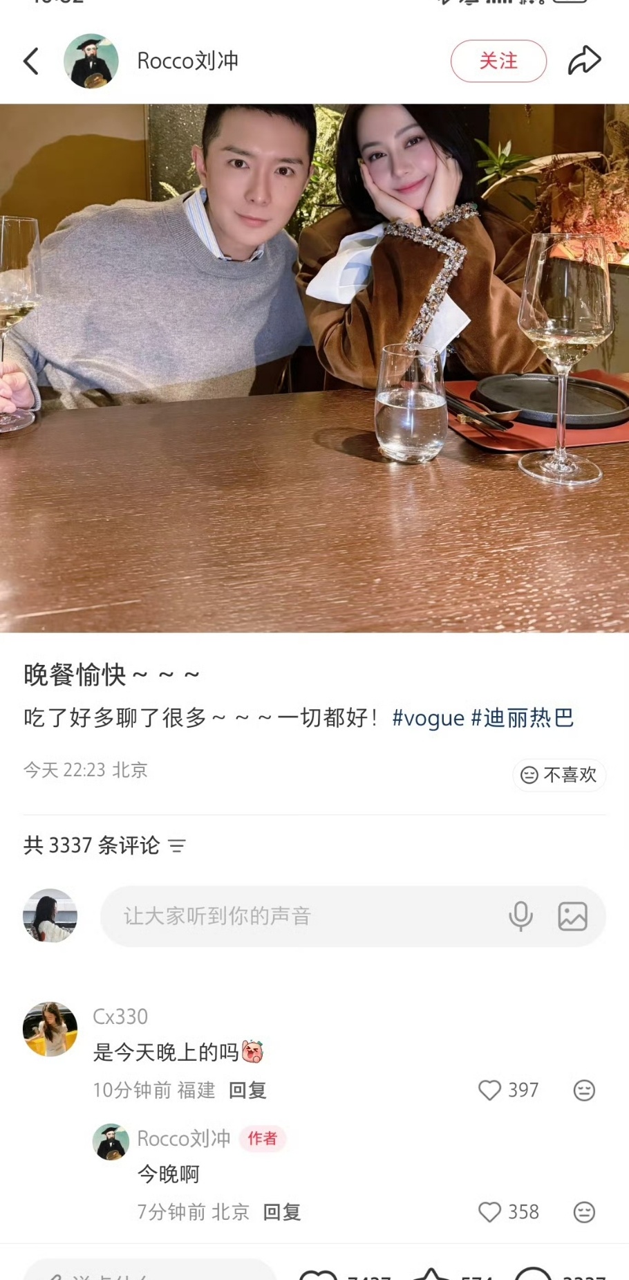 迪丽热巴回国首次公开露面迪丽热巴结束海外行程归国,与刘冲温馨聚餐,笑容清甜,气色超棒。这是给粉丝最好的回应刘冲和迪丽热巴聚餐