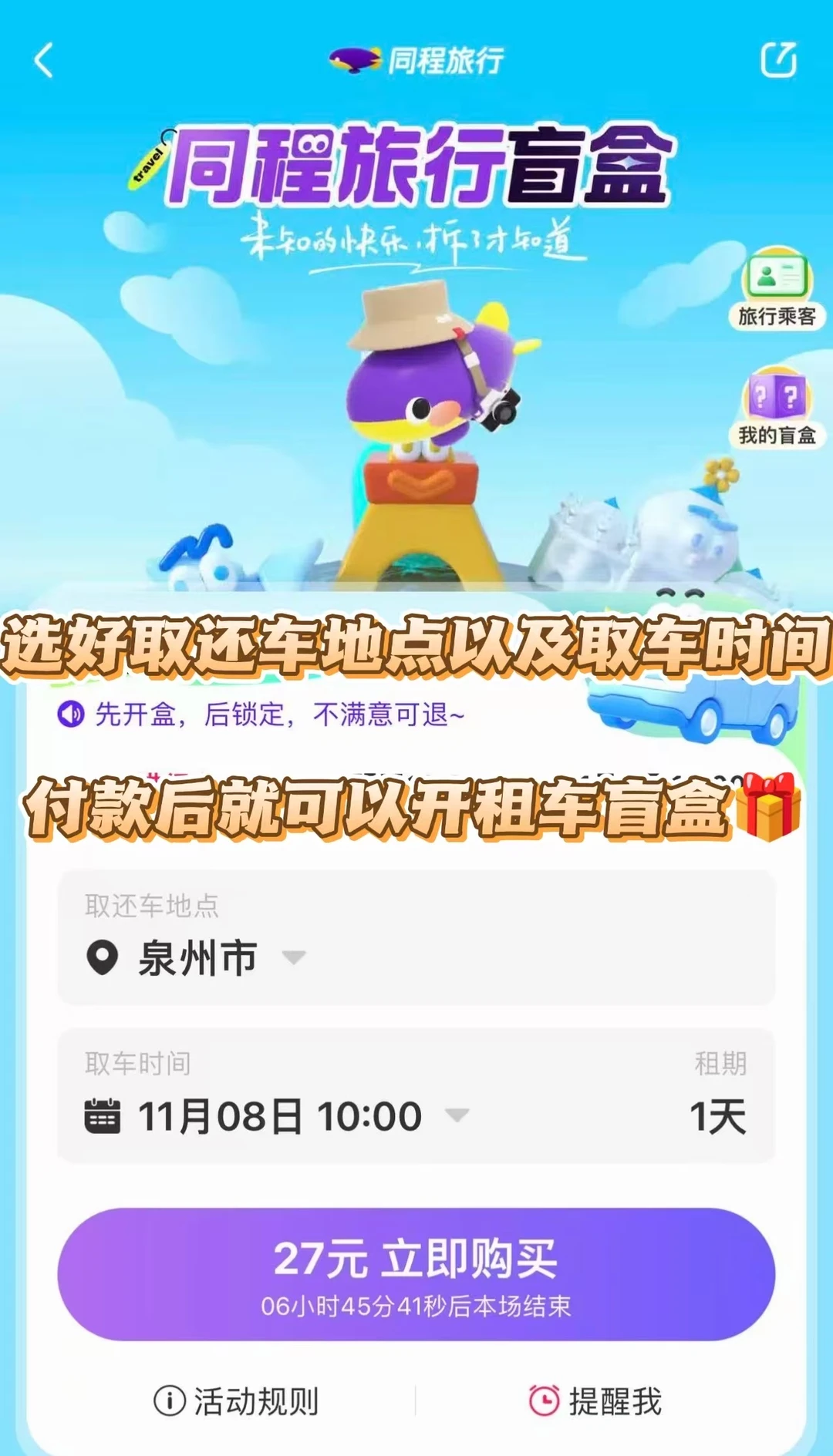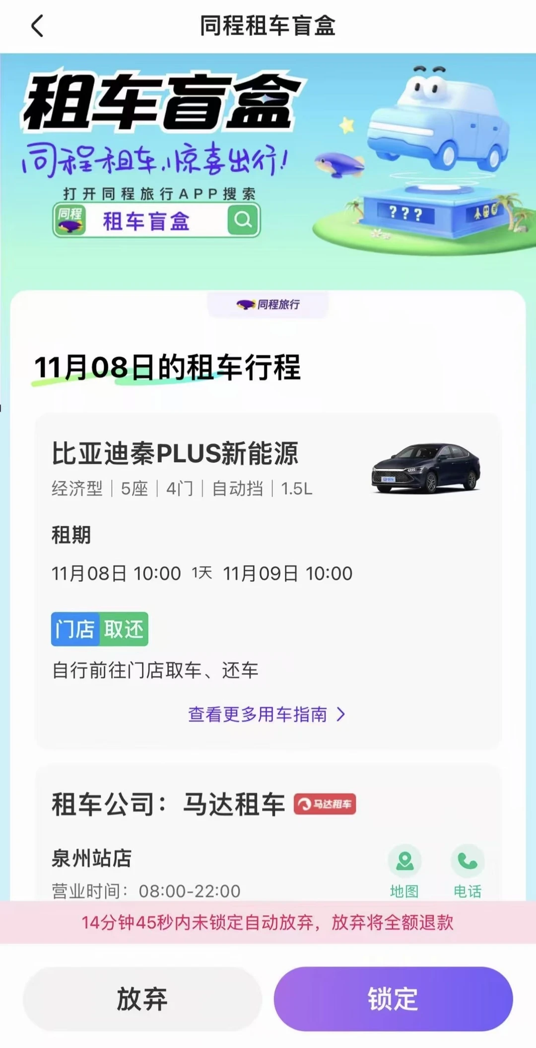 我这次和朋友去泉州自驾是开的同程旅行的租车盲盒,27块就能拿下,包含了租车费、服务费和基础保险这些费用。
