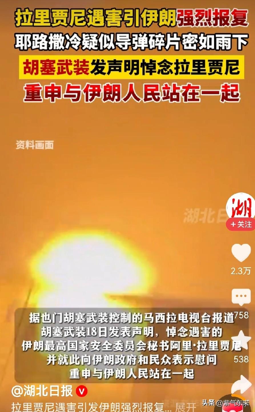 拉里贾尼明明知道自己被盯上了 还要以身入局,这种大无畏的牺牲精神也将彻底唤醒伊朗和伊朗人民! 伊朗接下来会更加团结! 伊朗的政权也将会更加巩固! 伊朗也必将让以色列付出惨痛的代价! 伊朗最高国家安全委员会秘书阿里·拉里贾尼的死彻底让伊朗愤怒了! 无数个导弹、火箭弹和无人机划破苍穹飞往以色列,以色列也将为自己的狂妄付出惨痛的代价! 就像伊朗外长所说的那样,我什么都不怕,就怕你他们来瞄准我吧!即便我牺牲了,也很快会有新的外长,丝毫不影响伊朗政权的运转!伊朗拉里贾尼