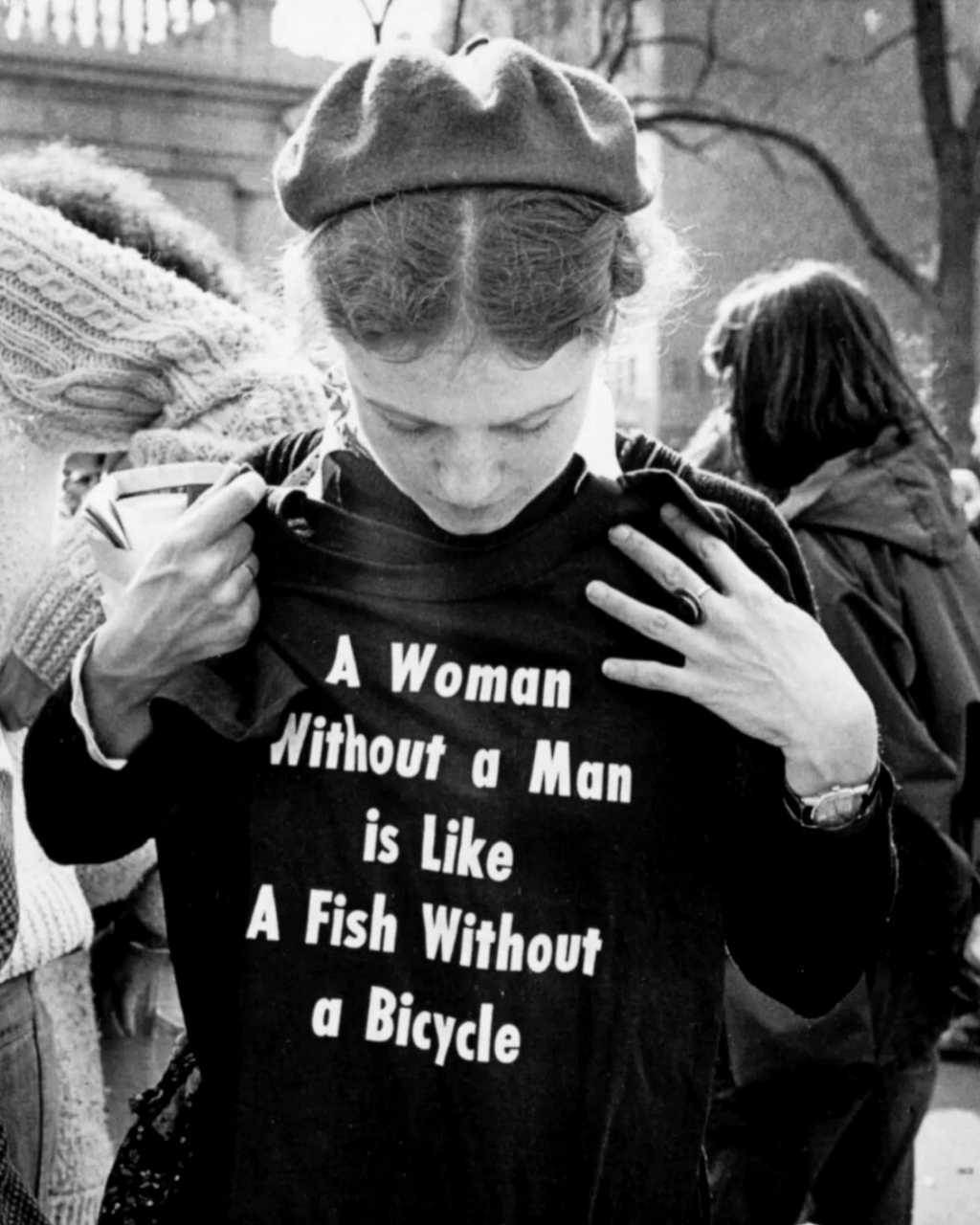 【来自投稿】1977年国际妇女节的一次游行中,妇女们穿着一件写有“女人没有了男人就像鱼没有了自行车”标语的上衣。