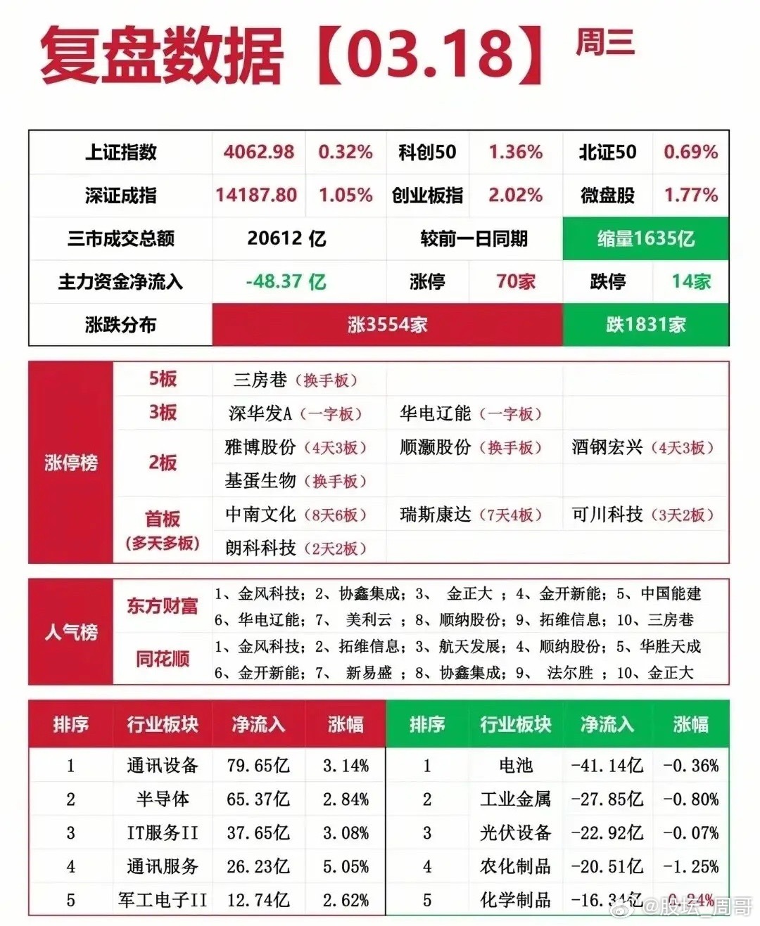 科技主线强势,资金聚焦算力与光模块!周三复盘资料来了!