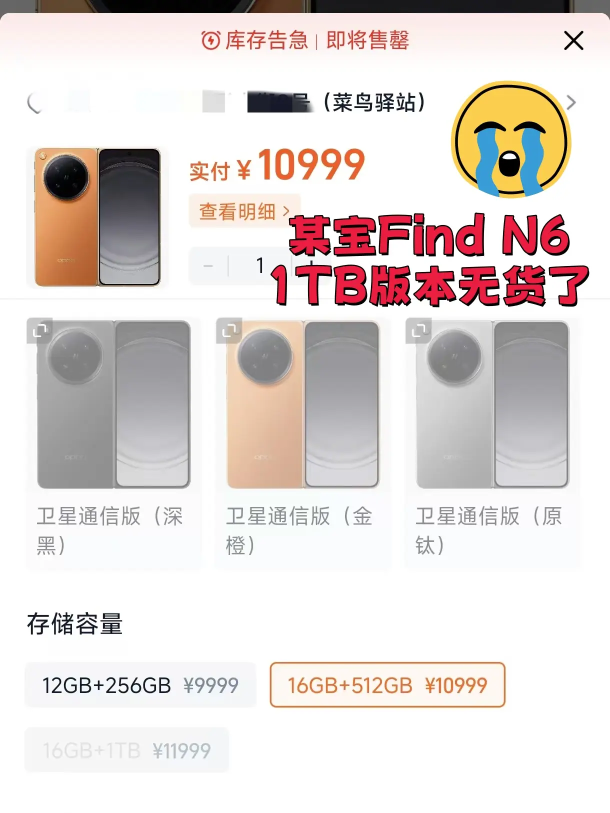 早上才刷到站哥说1TB预售创纪录,心想晚点也预定一台 结果下午打开某东某宝——全灰了!!1TB版本直接显示“无货”, 内存涨价前大家都学聪明了,全在抢大容量。只能说犹豫就会败北🫠 现在就蹲个补货提醒,有货了请踢我一脚!! #FindN6 #1TB大内存 #全网缺货 #抢不到系列 #1TB内存