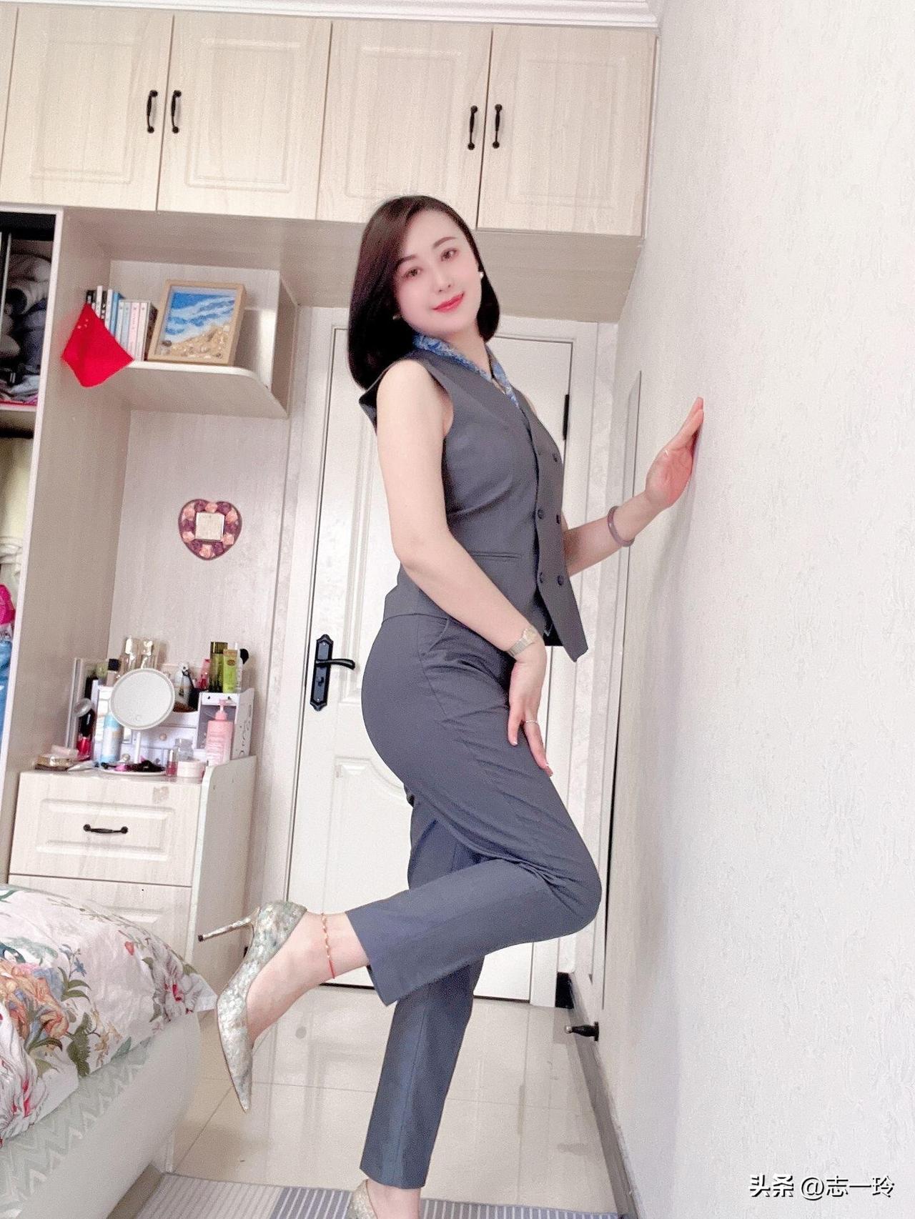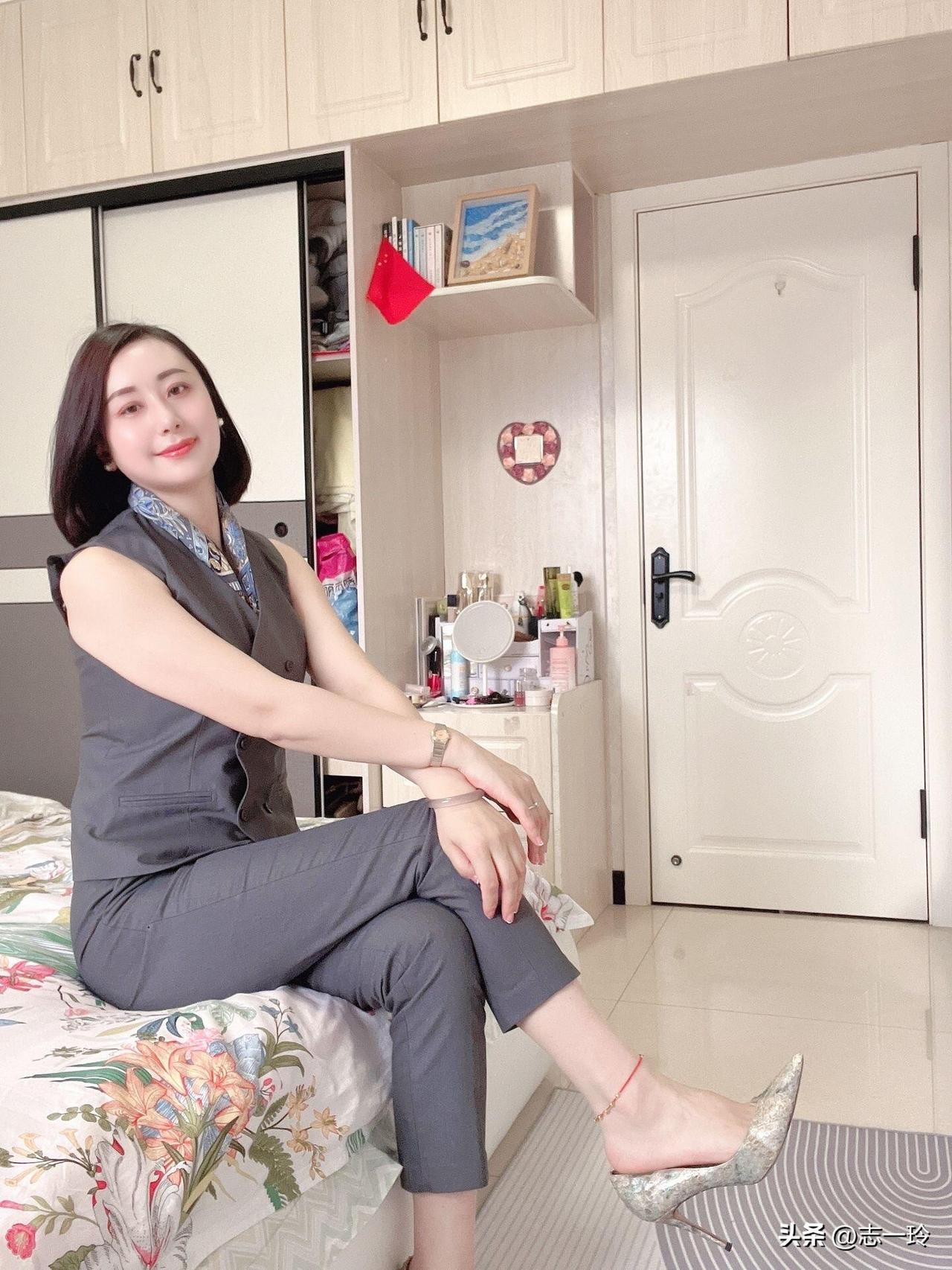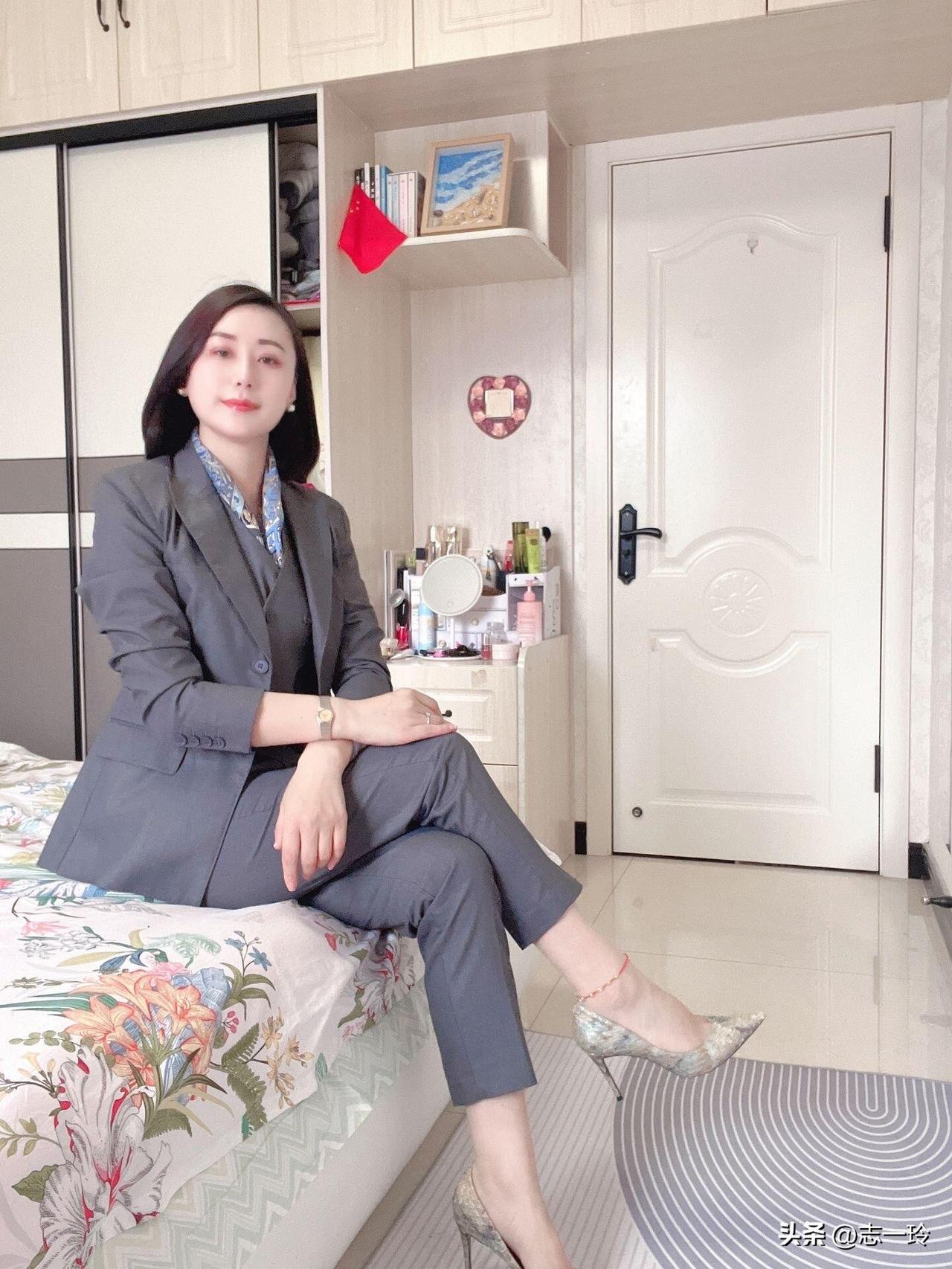 这位女士穿着一身灰色西装,坐在床上,脚搭在地板上,显得非常时尚和自信。