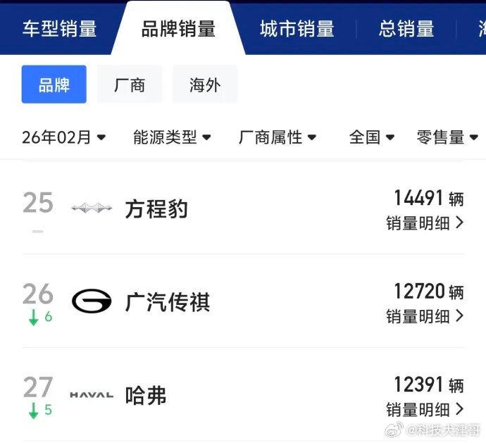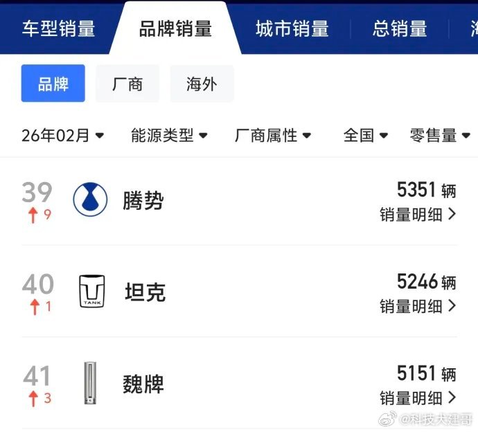 从数据看,长城旗下品牌(哈弗、坦克、魏牌)在2月销量榜单中排名集中在25-41位,确实处于中后段。核心问题是“多品牌未形成合力,新能源转型节奏滞后”: