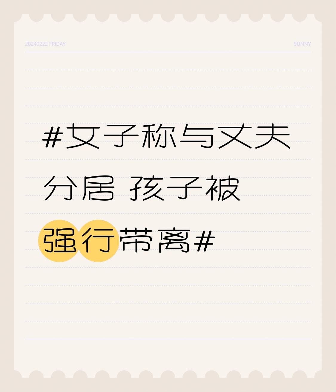 女子称与丈夫分居 孩子被强行带离 “女子称与丈夫分居,孩子被强行带离”这事儿太闹心了。就像向女士,因丈夫家暴分居,儿子原本跟她生活。结果丈夫趁儿子在游乐园玩,私自把孩子从湖南带到安徽,还拉黑她微信。向女士申请禁令,法院认定丈夫藏匿孩子,要求送回,可丈夫不服复议还被驳回,孩子却依旧在丈夫那儿。 这种“抢孩子”行为,既伤害孩子,也侵犯另一方监护权。婚姻有矛盾,不该让孩子成为牺牲品。希望法律能保障向女士权益,让孩子回到熟悉的环境,别让孩子在这场纷争中受更多伤害。