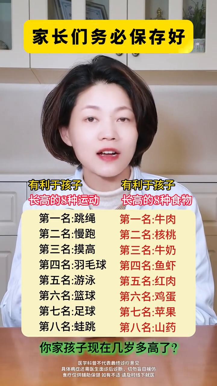 家长们务必保存好有利于孩子长高的8种运动。 长高的8种食物: ·第一名:跳绳。 ·第二名:慢跑。 ·第三名:摸高。 ·第四名:羽毛球。 ·第五名:游泳。 ·第六名:篮球。 ·第七名:足球。 ·第八名:蛙跳。 ·第九名:山药。 你家孩子现在几岁多高了? 食疗仅供辅助保健,如有不适请及时线下就医。