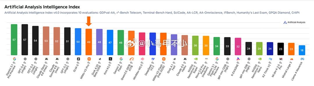 在全球权威大模型综合智能排行榜 Artificial Analysis 上,MiMo-V2-Pro 位列全球第八,国内第二。