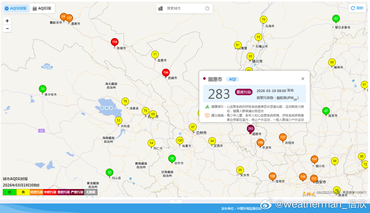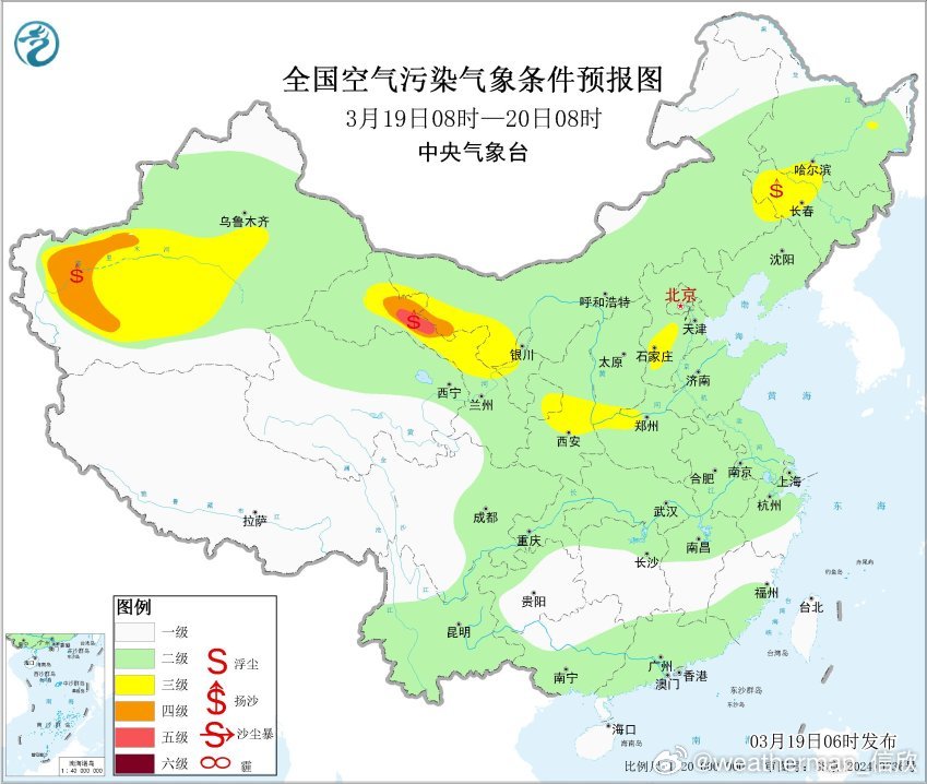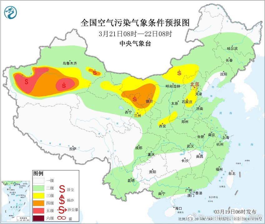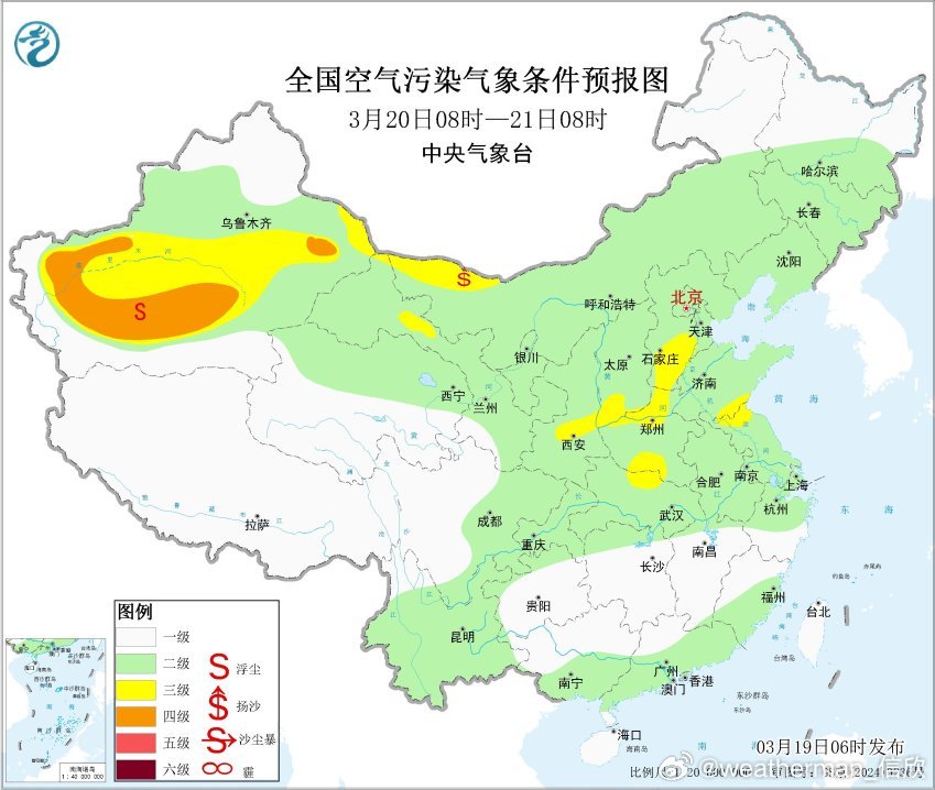 从空气质量看,安徽河南湖北部分地区还有些霾,辽宁和黑龙江局地也有霾。在西北地区,还有沙尘导致的污染。不过总体的沙尘不强,大多是轻度污染,宁夏固原有重度污染。19日和21日,新疆南部、内蒙古中西部、甘肃西部等地的部分地区有扬沙或浮尘天气。此外20-21日陕西关中和华北等地,在地面高压后侧南风里,可能有些轻度的霾。