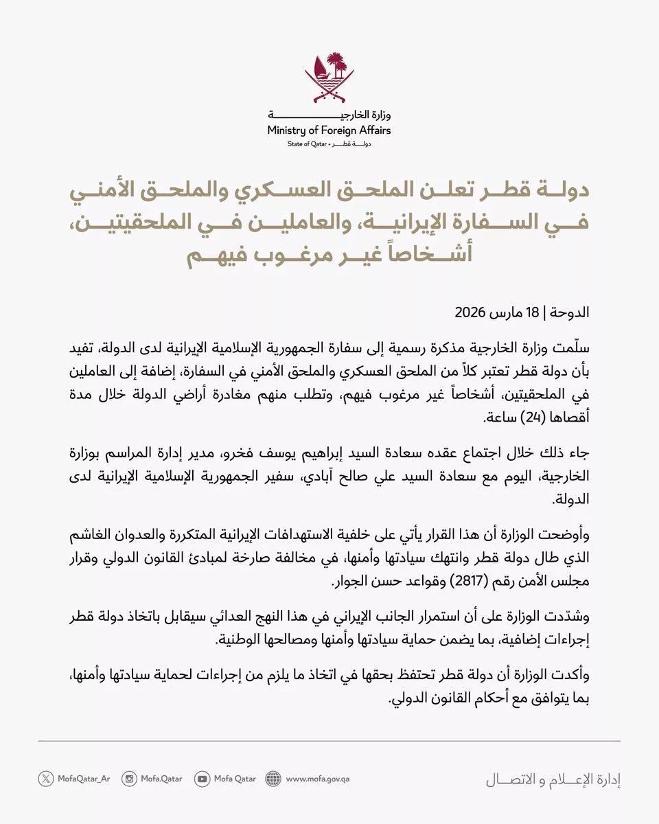 半岛电视台报道,当地时间18日,卡塔尔外交部发言人马吉德.安萨里宣布,由于伊朗政府频繁袭击多哈的关键设施、破坏大型能源资产,公然损害卡塔尔主权,危害我国安全,卡塔尔政府决定全面驱逐德黑兰的外交人员,并将勒令所有伊朗使馆官员限期离境。 安萨里在声明中强调,如果伊朗继续试图实施袭击,采取敌对性行动,为维护国家安全,保障本国主权及利益,多哈将被迫采取回应行动。