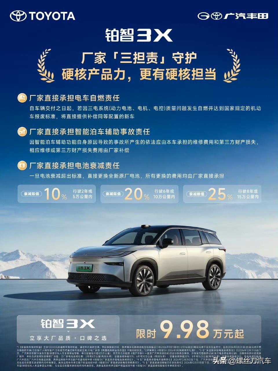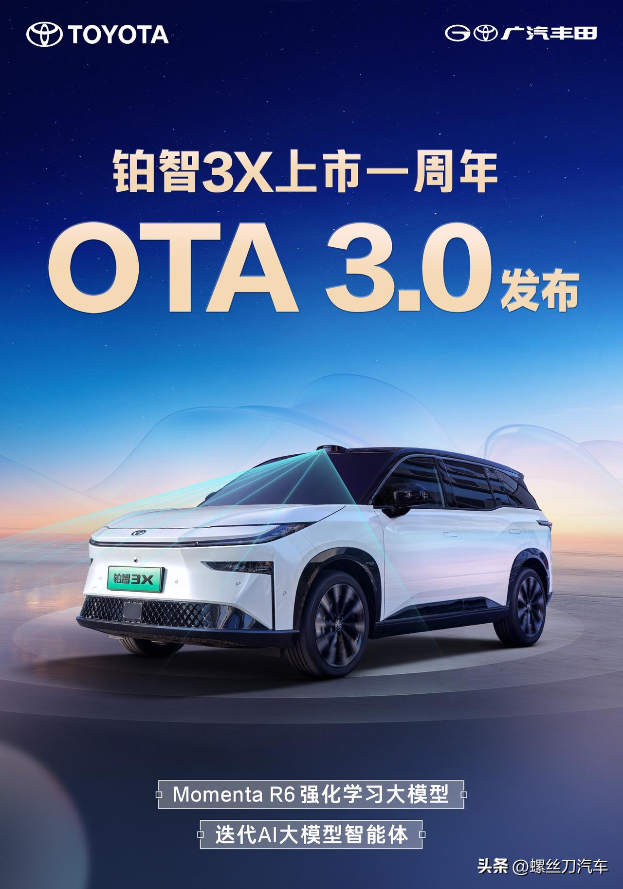 广汽丰田铂智3X上市一周年,迎来重磅OTA升级,老车主也能免费升级R6大模型! 3月18日,广汽丰田铂智3X官宣重磅OTA升级,重点聚焦用户最关心的智驾、智舱、安全三个方面。本次升级,不是一次常规更新,而是把用户高频使用的用车体验集中做了一轮迭代。本次升级里,最有含金量的一点,是Momenta R6强化学习大模型免费上车,而且覆盖全量车主。 上市一周年,铂智3X累计销量已经突破8万台,连续5个月拿下合资新能源销冠。对一台新能源车来说,卖得好,说明用户愿意买,卖出一年后还在持续升级,说明品牌愿意持续投入。更关键的是,老车主这次也能免费升级R6大模型,不用因为买得早,就错过新技术。 这次R6大模型上车,更像是给辅助驾驶换了一套更成熟的判断逻辑。遇到加塞、汇流、鬼探头这类情况,系统判断更贴近日常开车习惯,动作衔接也更自然,车里的人不会总被突兀反应吓到。再加上新增智驾单次行程报告,开完一段路,系统怎么判断、怎么执行,用户都能直接看到。以前是开完只知道“用了”,现在连“为什么这么开”也能看明白。这一轮升级,解决了大家最常吐槽的“一惊一乍”,更像老司机提前看路、顺势处理,让用户使用智驾时更有安全感。 广汽丰田每次OTA升级,关注的都是用户最常用、最在意的场景。这次重磅OTA,把大家最关心的智驾、智舱、安全体验一起往前推,尤其是R6大模型免费覆盖老车主,让“新版本”不只属于新用户。 对合资品牌来说,卖出去以后还能持续升级,早就不只是附加项,而是今天必须拿出来的硬实力。铂智3X上市一周年、销量突破8万、连续5个月合资新能源销冠,再加上这次覆盖全量车主的重磅OTA,也让一个信号越来越清晰,广汽丰田在智电转型这条路上,已经稳稳站住了脚跟。