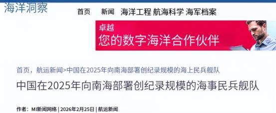 241艘包场封海!美智库绝望,外军寸步难行,中国不发一弹控南海   2026年2月24日华盛顿智库AMTI发布年度报告,和往年不同,报告里一个数字让分析师们陷入沉默241,这是2025年全年每天平均出现在南海争议海域的中国船只数量,创下历史最高纪录。   可能有人会疑惑,这241艘船到底是什么船。它们不是解放军的军舰,也不是普通的打鱼渔船,而是经过专业化改造的海上民兵船。   AMTI作为美国战略和国际研究中心的分支机构,常年盯着中国在南海的活动。这家智库嘴上说着不持任何立场,实则一直刻意炒作中国“军事化”南海,可这次的数字,却让他们找不出任何煽风点火的由头。   分析师们沉默的核心原因,是他们看清了这241艘船背后的管控逻辑。过去几年,南海争议海域偶尔会出现外军舰机挑衅,中方此前的应对多以海警巡逻为主,规模和密度都没达到现在的水平。   2025年这一整年,中方彻底调整了南海管控策略。这些海上民兵船实现了职业化转型,不再是以前临时编组的散兵游勇。它们由国家补贴统一建造,采用钢制船体并经过特殊加固,能应对复杂海况和轻微碰撞。   每一艘船都配备了北斗四代卫星导航终端,定位误差控制在两米以内,信号可直接连接三亚岸基指挥所,能和海军、海警实现实时互联互通。单边电台、海事卫星电话等设备也一应俱全,确保全天候通讯畅通。   这些船的部署没有任何挑事的意味。它们不发一炮,不主动撞击任何外方船只,只是按照既定航线,在黄岩岛、仁爱礁等核心争议海域常态化停泊、巡逻。   可就是这种看似温和的存在,让频繁闯入的外军陷入了两难境地。外军侦察机多次抵近侦察,舰机也反复试图突破值守线,却始终找不到动手的理由。   这些民兵船挂着民用标识,以合法航行的名义驻守在南海海域。外军一旦开火,就属于公然袭击民用船只,不仅会背负国际骂名,还会陷入舆论被动,这是他们绝对不敢承担的后果。   要是按兵不动,外军就只能被这241艘船形成的防线挡在核心区域之外,寸步难行。这种低烈度、高密度的存在,比任何军事威慑都更有力量。   美智库的绝望,不止源于这241艘船的规模,更源于他们无法破解中方的管控思路。中方没有选择硬碰硬,而是用“持久存在”的方式,实现了对南海关键海域的事实管控。   很多人不知道,这些海上民兵船还有明确的值守机制。它们实行十四天一轮换,实际执行中还会缩短至十一天,彻底杜绝了海域管控的空窗期,让警戒密度始终保持在高位。   中方还主动优化了部署策略,撤离了非核心礁石的值守力量,将资源集中投向敏感核心区域。这种调整不是盲目收缩,而是精准发力,让每一艘船都能发挥最大作用。   中国海警也在同步配合行动,持续加强在南海争议海域的执法巡查,依法跟踪监视、警告驱离非法侵权滋扰的外籍船舶和飞机。海军则作为后盾,形成了民兵、海警、海军三层协同的管控体系。   外军此前在南海的挑衅,大多是利用中方管控的间隙,搞一些试探性动作。如今241艘船全天候、无死角常驻,让外军的任何小动作都能被及时发现、快速应对。   AMTI的报告里,还隐晦提到一个细节,2025年外军舰机在南海争议海域的活动频次,较上一年下降了近40%。这个数据足以说明,中方的管控已经起到了实实在在的效果。   有人会问,养这么多船常年驻守,成本会不会太高。其实这种投入,远比动用军舰更划算,也更安全。动用解放军海军,容易引发外军误判,甚至导致局势升级;可要是消极退让,南海主权就会被不断蚕食。   海上民兵船的出现,恰好解决了这个难题。它们既是移动的主权界碑,也是完美的战略缓冲,用最小的成本,实现了最大的战略目标。   中国外交部和国防部多次明确表态,中方在本国管辖海域的正常活动,正当合法、专业克制。南海是中国的固有领土,中方维护国家领土主权和海洋权益的决心,从来不会动摇。   美智库之所以绝望,是因为他们清楚,南海局势已经超出了他们的掌控。中方不发一弹,就用241艘船实现了对南海的有效管控,这种以柔克刚的方式,让他们的霸权思维彻底失灵。   现在的南海,和平、合作、友好才是主流。那些试图兴风作浪、无事生非的势力,终究会被时代淘汰。中国用自己的方式,守护着这片海域的安宁,也向世界展现了负责任大国的担当。