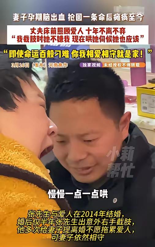 泪目了!”河南焦作,一对新婚夫妻结婚刚半年,结果丈夫就意外失去右臂,本想让妻子离开自己,可妻子却死活不肯。一年后妻子怀孕,本是一件好事,没曾想又突发意外,抢救后智力仅剩3岁,生活完全无法自理。如今9年过去,丈夫用仅剩的左臂撑起这个家,他说出一句话,让全网泪崩…… 这场变故始于工地的一次机械事故,高速运转的设备突然故障,丈夫张凯的右臂被严重绞伤,医院只能做截肢处理。刚新婚半年的他,看着自己残缺的身体,第一反应不是心疼自己,而是怕拖累年轻的妻子芳芳。他整夜坐在床边发呆,天亮后红着眼跟妻子提分开,说自己成了残疾人,给不了她安稳日子,让她趁着年轻重新选择生活,甚至把妻子的行李整理好,逼着她离开这个家。芳芳死死攥着他的左手,眼泪砸在他的手背上,全程不发一言,只是不停摇头,又把收拾好的东西一件件放回原位,用最执拗的态度告诉丈夫,她不会走。 两人靠着打零工勉强维持生计,日子虽苦却也有盼头,一年后芳芳顺利怀孕,这个未出世的孩子,让低谷里的家庭看到了新希望。谁也没能想到,怀孕刚两个月,芳芳在家中突然头晕栽倒,送医后被确诊为突发脑出血,出血位置凶险、出血量极大。医生当着张凯的面,问出那个最残忍的问题,保大人还是保孩子。张凯没有半分犹豫,颤抖着手签下抢救妻子的同意书,他心里清楚,妻子是他的家人,只要人在,家就还在。 手术保住了芳芳的性命,却让她彻底失去自理能力。脑部神经的永久性损伤,让她无法正常说话,肢体活动严重受限,智力直接退化到三岁孩童水平,吃饭、穿衣、翻身、上厕所,每一件小事都需要旁人全程照料。张凯看着曾经温柔开朗的妻子,变成连亲人都认不出的模样,心里满是酸涩,他不敢在家人面前流露脆弱,只能在无人的角落偷偷平复情绪。 他知道自己不能倒下,唯一的左臂,成了支撑整个家的全部力量。为了兼顾生计与照料妻子,他在自家门口开了一间小型快递驿站,收发快递的间隙,就跑回屋里给芳芳喂水、擦身、做肢体按摩。每天清晨五点,他就要起床准备三餐,把饭菜煮得软烂易食,用左手一勺一勺慢慢喂给妻子,芳芳情绪烦躁时会抗拒进食,他就耐着性子轻声安抚,直到妻子愿意配合。 家庭的重担远不止这些,张凯的父亲查出癌症,需要定期接受治疗,年迈的母亲只能勉强搭把手照顾芳芳,所有的压力最终都落在张凯一个人身上。九年时间里,他没给自己添置过一件新衣物,没有睡过一个完整的安稳觉,左臂因长期超负荷用力,常年酸痛僵硬,掌心和虎口磨出的厚茧,一层叠着一层。 芳芳偶尔会出现短暂的清醒,对着张凯露出模糊的笑意,这一点点细微的反应,都能让他开心许久。他把妻子的护理细节记在小本子上,喂食时间、按摩频次、安抚方式,每一项都记得清清楚楚。街坊邻居看他实在辛苦,主动上门帮忙,也有亲友劝他别太过为难自己,他都笑着婉拒,心里始终记着妻子当初的不离不弃。 媒体上门采访时,记者问他九年坚守是否疲惫,有没有过动摇的时刻。张凯用左臂轻轻擦了擦眼角,说出的话没有华丽修饰,却直直戳中所有人的泪点。他说当初她没丢下残疾的我,现在我就不能丢下生病的她,她还在,这个家就在。这句话在网络上快速传播,无数网友被这份朴素的坚守打动,纷纷留言称赞这才是婚姻最真实的模样。 九年风雨,没有海誓山盟的浪漫,只有日复一日的担当与陪伴。张凯用一只手臂扛住了命运的重击,守住了妻子,守住了家庭的完整。真正的相守从不是顺境里的相伴,而是困境中不松手、不放弃的执着,是把彼此的余生,牢牢扛在自己肩上。 各位读者你们怎么看?欢迎在评论区讨论。