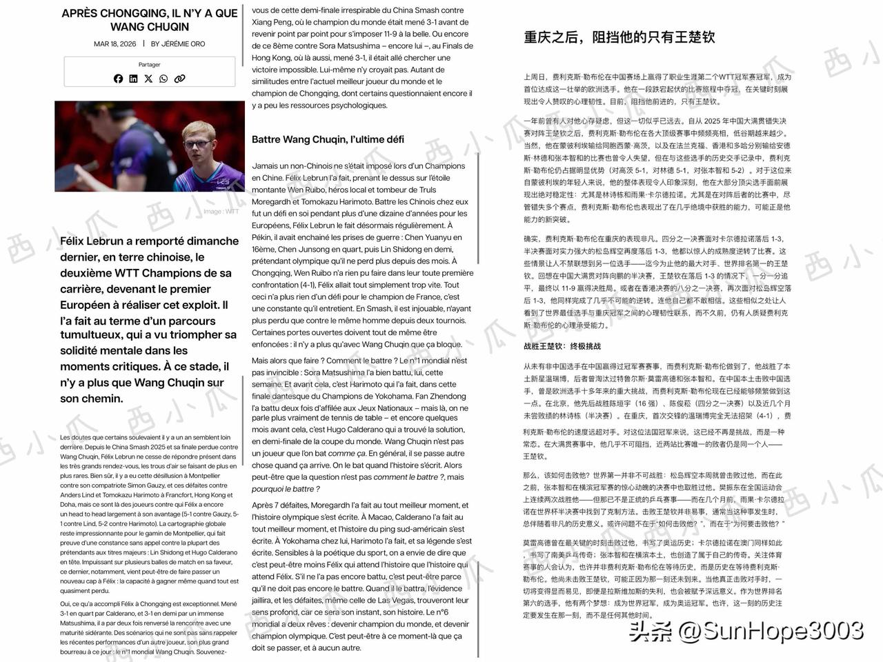 法媒报道,重庆之后只有王楚钦可以阻挡勒布伦。 勒布伦战胜温瑞博,夺得重庆冠军赛的冠军, 其中也战胜了排名靠前的雨果, 法国媒体报道了勒布伦的国际赛果,汇总了和中国队的比赛成绩, 目前只有和王楚钦对战,他保持了被零封的成绩, 中国大满贯,新加坡大满贯,都是王楚钦轻松的战胜他。 法媒认为,目前王楚钦是勒布伦的终极挑战。 但是每个人都是进步的,陈垣宇,温瑞博他们,也都会努力,林诗栋也已经在系统调整中, 下一次见面,希望都会有好成绩。 王楚钦是国乒的底气,当然他的压力也很大,面临整个乒坛的挑战。