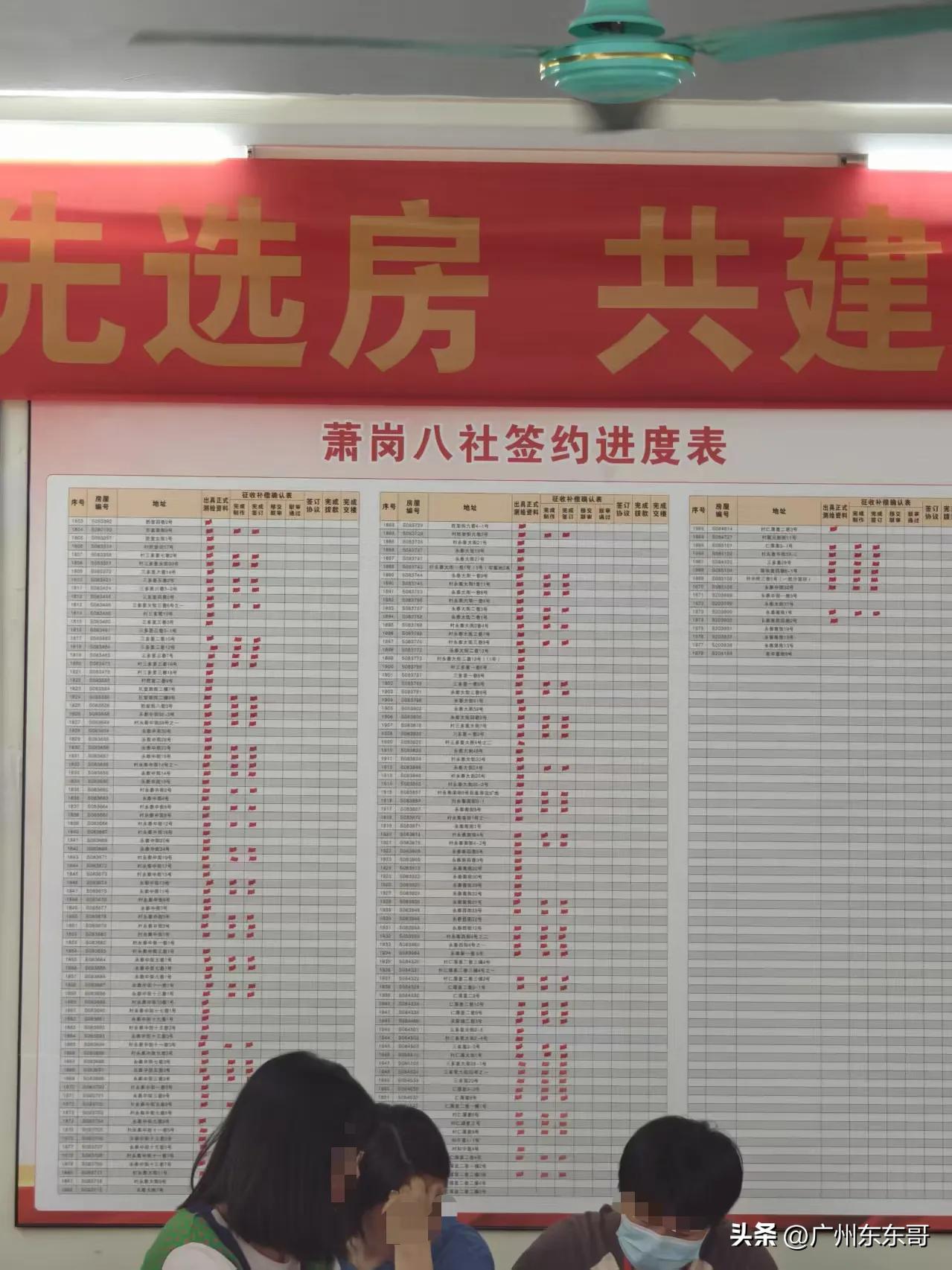 加快签约,白云萧岗村旧改提速! 举办集中签约仪式,现场发放现金奖励,真金白银等你来拿,谁看了不心动? 台上的10位村民代表排队领钱,台下的村民也是踊跃去咨询,萧岗八社是其中一个签约点,从其签约进度表来看,大部分都已经完成征收补偿的确认,就等补偿款到账了。 整个萧岗村签约意愿也不错,月初启动签约,半个月已经签约2300栋,测量率达到85%。 把自己的房子交出去了,其实村民最关心的还是何时能有新房子住。 结合相关公告,萧岗村首期安置房大约1940户,预计2028年1月完工。 所以这里面是不能满足全村3000多户需求,先签约的村民还是有优势的,可以早点入驻新房。而后面签约的只能排队等候二期、三期的安置房了。