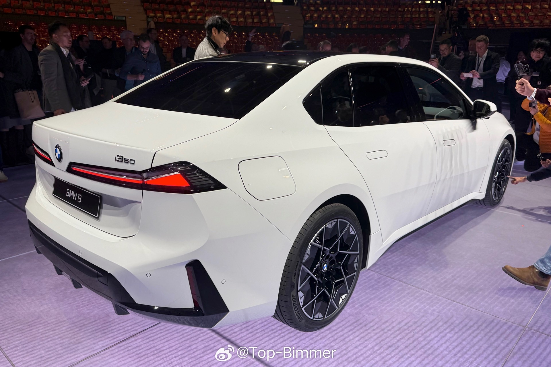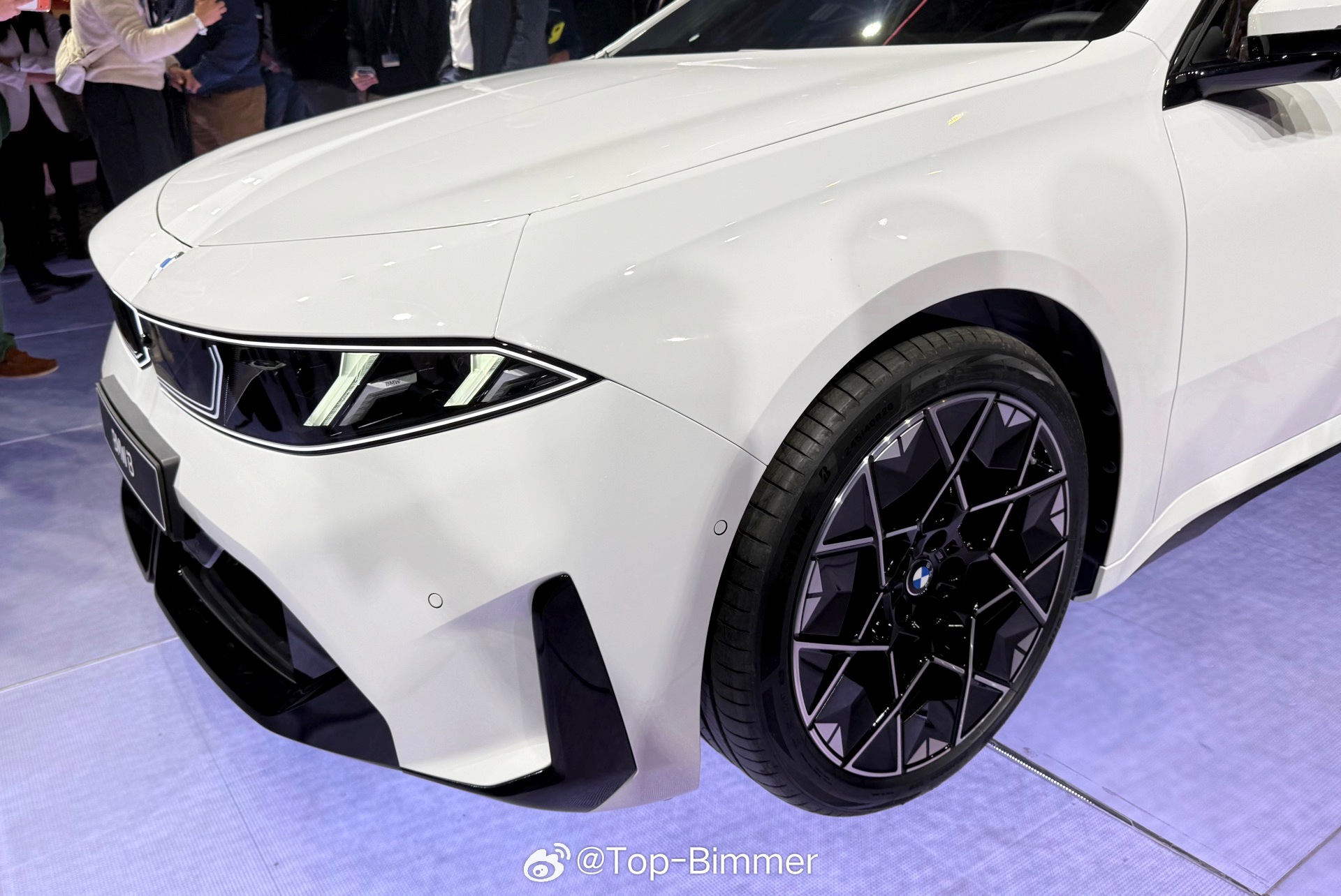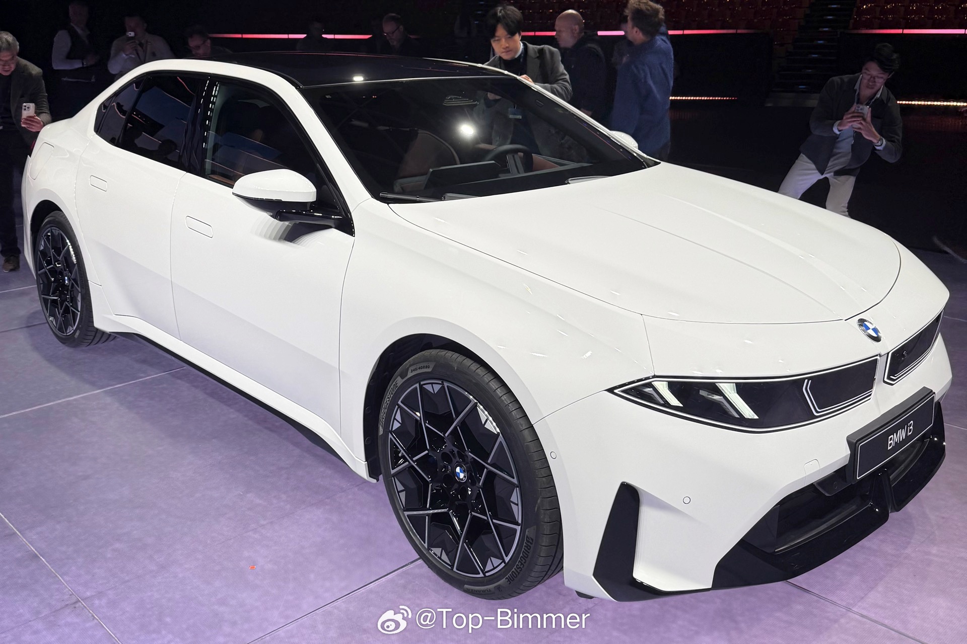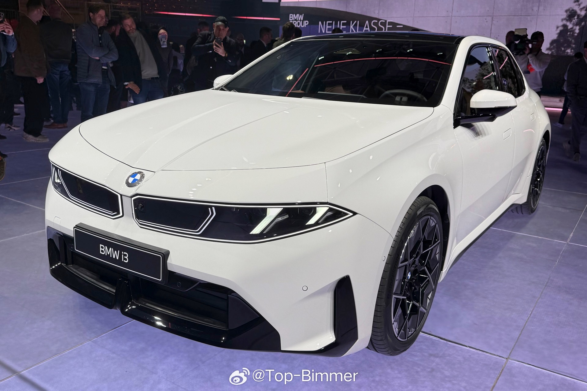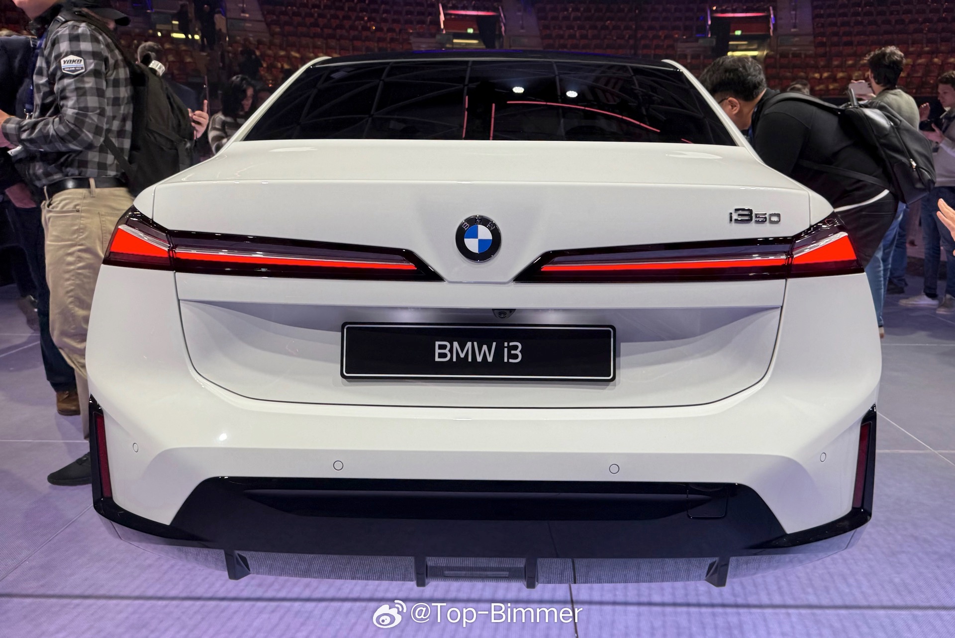 在慕尼黑发布会现场,还有一台配备雪山白的宝马i3,十分心动的感觉,主要是这款车漆和外观一系列的黑化套件能形成非常强烈的视觉反差,感觉很不一样。我猜测这应该是选装了M运动套装Pro,不然车窗边框肯定是镀铬的、前后大灯也不会是熏黑的。国外的这个“M运动套装Pro”你可以理解成国内的“曜夜套装”。
