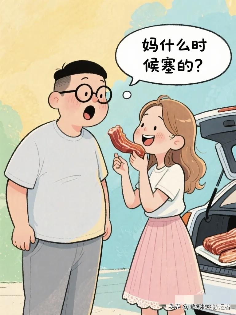 搞笑漫画:后备箱比来时还满,丈夫:"来的时候不是这些东西啊?" 妻子:"你妈给的腊肉。" 丈夫:"这一袋呢?" 妻子…