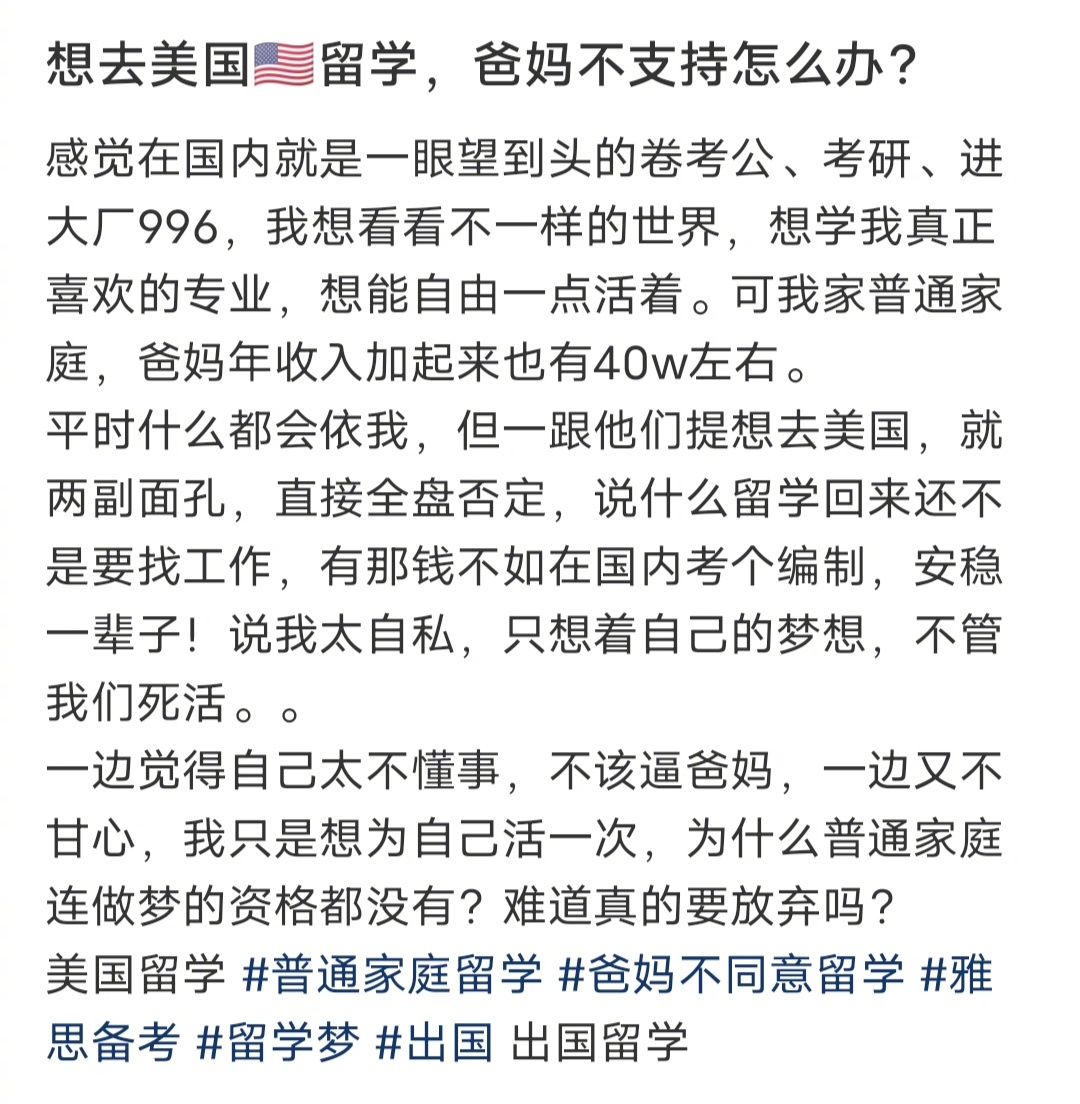 你有没有想过你去美国留学的代价是什么?代价就是你父母在国内累死累活赚钱,你在美国开开心心花钱,最后,钱也没了,工作也没了。你想为自己活一次,那你的父母还要不要活了?
