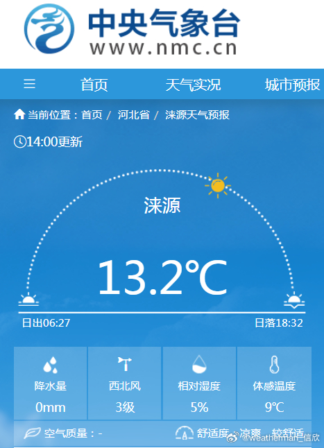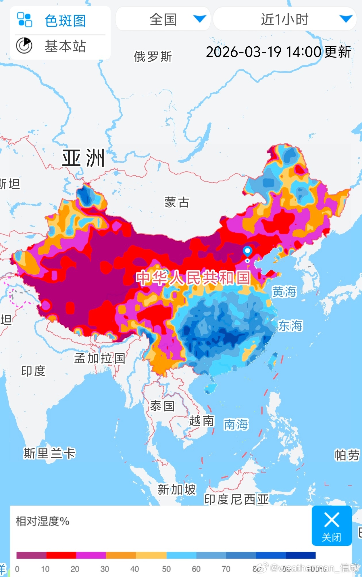 【南北干湿差异大】今天14时,北干南湿的局面维持,华北部分站点相对湿度≤10%,比如河北涞源5%、山西灵丘5%、内蒙古集宁7%、北京10%。而湖南江西部分站点在阴雨中,相对湿度达到了100%饱和,比如湖南衡阳、益阳、湘潭、江西萍乡。