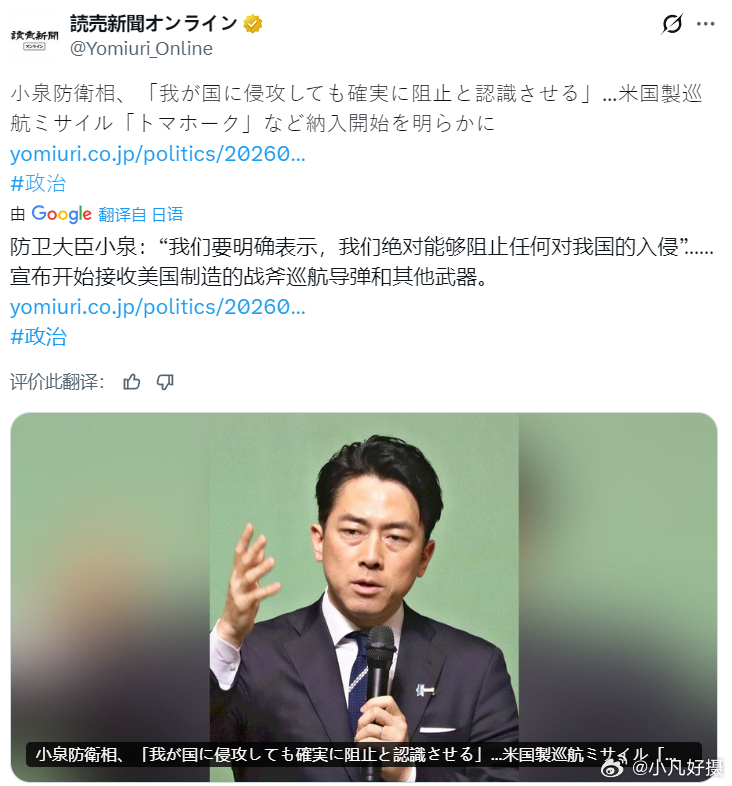 第一次听说谁要“入侵”日本!据日媒:小泉进次郎叫嚣“我们要明确表示,我们绝对能够阻止任何对我国的入侵……宣布开始接收美国制造的战斧巡航导弹和其他武器。”美国驻日大使格拉斯转帖叫唤:“美日的集体威慑力越强,印太地区就越安全。通过提升我们的防御能力,我们才能确保繁荣在这个快速发展的地区蓬勃发展。”有日本网友留言:“美国和日本政府的‘中国威胁论’,只不过是宣传而已。如果要摧毁日本,也不需要武器。资源和粮食都依赖进口的国家,只会在很容易失败。美伊以冲突俄罗斯警告日本美国以色列有分歧了黄媒不会说的真相