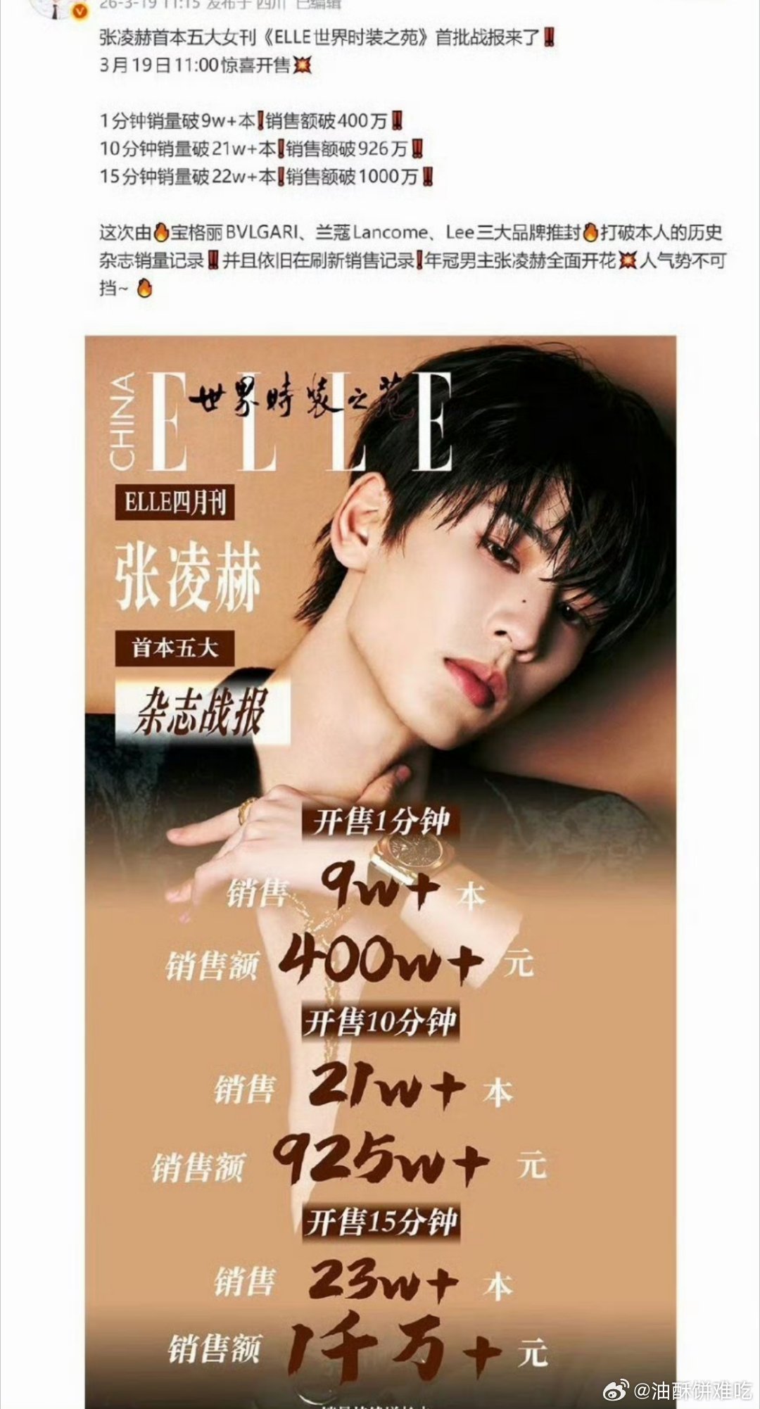 张凌赫首本五大15分钟销售额破一千万,进入内娱杂志千万俱乐部,坐等24h成绩!三