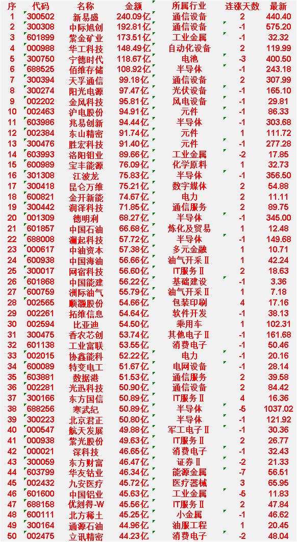 3月19日,成交金额最多的50名单汇总 新易盛:成交金额240.09亿,连涨2天,最新价440.40元 中际旭创:成交金额192.81亿,连跌(-1),最新价575.20元 紫金矿业:成交金额173.51亿,连跌(-1),最新价32.32元 华工科技:成交金额148.49亿,连涨2天,最新价119.99元 宁德时代:成交金额118.67亿,连跌3天,最新价400.50元 佰维存储:成交金额108.92亿,连跌(-1),最新价243.18元