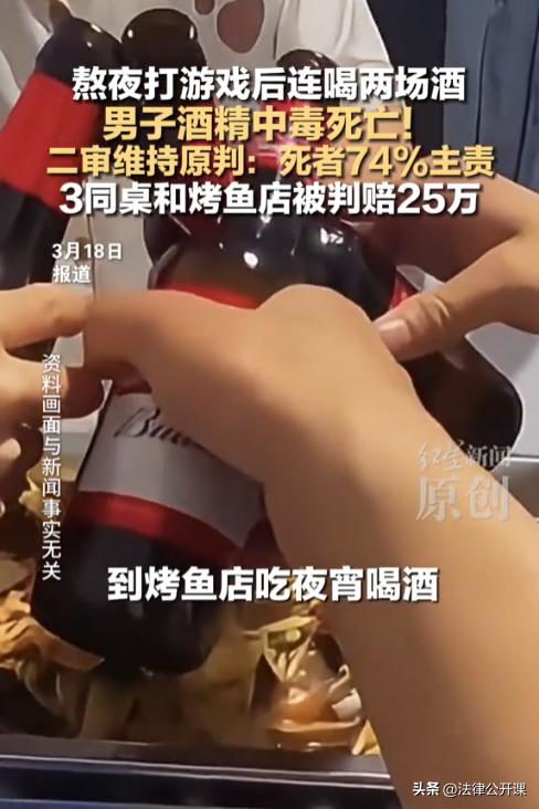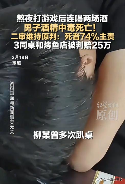“冤吗?”云南丽江,一男子通宵打游戏后,与朋友喝了一场酒,接着又去烤鱼店喝了场酒,最终因酒精中毒不幸身亡。谁知男子家属竟然将同饮者和烤鱼店告上了法院,开口就要78万元赔偿,而法院竟然真判赔了25万元。几个被告不服,纷纷提起上诉,认为一审判决并不合理。二审法院判了! 据悉,男子柳某的游戏瘾非常大,经常通宵打游戏,身体也彻底被拖垮了。 2025年5月27日,柳某在通宵了一晚上后,只是简单休息了一下就开始继续玩游戏,一直玩到了晚上。直到朋友宋某、李某等人喊柳某去吃饭,他才停下了手中的游戏。 之后几人在出租屋内喝了酒,大家你一瓶我一瓶,没一会儿就喝了好几瓶啤酒,柳某的脸都喝红了,说话也开始语无伦次。可他还硬撑着,朋友们劝他少喝点,他还不服气,非要接着喝。 大家一直喝到28日的凌晨,宋某突然接到朋友彭某的电话,说去烤鱼店再喝一场。这时候柳某已经醉了,可他听说等下要去吃烧烤,顿时又来了精神,跟着宋某去了烤鱼店,与彭某、唐某继续喝了起来。 彭某当时点了白酒4杯、红牛12瓶、劲酒14瓶,都是兑着喝的。柳某因为之前已经喝过一场,加上这次喝的是兑的酒,没一会儿就喝趴了。期间,柳某醒来还表演了当众小便。 宋某等人见柳某小便结束后,又要继续喝,也配合着喝了几口,随后柳某又趴桌了。 凌晨6点多,彭某结账后与唐某先离开了,宋某则留了下来照顾柳某。结果彭某等人刚离开不久,柳某就开始了全身抽搐。 宋某当时慌了神,烤鱼店的服务员也慌了,这要是在店里出啥事,那自己也脱不了干系,于是服务员直接叫了救护车,还叫来了民警。 可等医护人员赶到现场进全力抢救后,也没能把柳某给救回来,最终柳某被确诊酒精中毒死亡,其血液中的酒精浓度已经高达435mg/100ml了,早就超过致死量。 再加上柳某熬了一整晚,身体本来就虚,过量饮酒就是压垮他生命的的最后一根稻草。 柳某的家人得知消息后,悲痛欲绝,他们实在无法接受儿子就这么没了。 之后,警方介入进行了调解,约定由宋某赔偿柳某的家人2万元,唐某和彭某二人共赔偿2万元。 唐某和彭某直接就赔了钱,但宋某不愿意,他认为是柳某自己逞强要喝酒的。 至于烤鱼店,当时因为柳某在店内身亡,所以支付了600元把柳某的遗体运到了殡仪馆。 然而柳某的家人认为这点赔偿不足以弥补损失,于是将宋某、唐某、彭某以及烤鱼店告上了法院,要求他们承担35%的责任,赔偿78万余元以及精神损失费。 一审法院经审理后认为,柳某的死因是喝酒过量导致酒精中毒,其作为成年人应当有自制能力,故柳某自身存在主要过错。 宋某等人作为共饮者,相互之间具有照顾的义务。 宋某等人明知柳某已经喝过一场酒,且已经处于醉酒状态,仍继续兑酒给柳某喝,这与柳某因过量饮酒导致酒精中毒身亡具有因果关系。 《民法典》第1165条规定,行为人因过错侵害他人民事权益造成损害的,应当承担侵权责任。 在柳某醉酒期间,烧烤店服务员已经注意到了柳某因醉酒迷糊导致当众小便,此时服务员应当引起重视,提醒柳某少喝酒,但服务员并没有任何提醒。 综上,一审法院认定,宋某因与柳某喝了两场酒,所以他的过错最大,应当承担15%的责任,唐某和彭某共同承担9%的责任,烧烤店承担2%的责任。 经过核算,柳某家属的损失有96万余元,故宋某应当赔偿14万余元以及精神损失费1.1万余元,彭某与唐某共同赔偿8万余元以及精神损失费7000元,烧烤店赔偿1.9万余元以及精神损失费1500元。 对于一审法院的判决,烧烤店选择多一事不如少一事,未再上诉,但宋某等人不服,提起了上诉。 宋某等人认为,柳某在喝酒前已经熬了一个通宵,但他们并不知道,柳某死亡与其熬夜导致身体机能下降也有关系。 二审法院经审理后认为,柳某通宵确实会导致身体疲乏,加上过量饮酒对身体危害极大。 可鉴定结果只显示柳某的死因与饮酒过多有关,死因是酒精中毒,并没有确凿证据证明与通宵熬夜有直接关系,而过量饮酒与宋某等人具有因果关系。 最终,二审法院判决驳回了宋某等人的全部诉请。 有人说,25万也换不回一条人命,也哄不好柳某的爸妈。 也有人说,同饮者太冤了,不该替别人的任性买单。 大家对此怎么看?