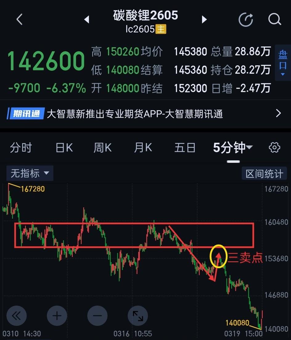 碳酸锂2605,阶段性调整正徐徐拉开帷幕。 今天碳酸锂形成了图(1)五分钟中枢的向下离开段。该离开段在次级别(图2)昨天产生三类卖点后,当下并没有形成明显止跌结构。明天仍可谨慎跟随该离开段继续向下生长。 细节上,明天能否有效站稳146660是关键。若站稳,图(1)的向下离开段将面临结束,图(1)也将呈现盘整背驰的走势结构。若不能站稳,图(1)的向下离开段将继续生长。后期仍将由空头主导走势的结奏。