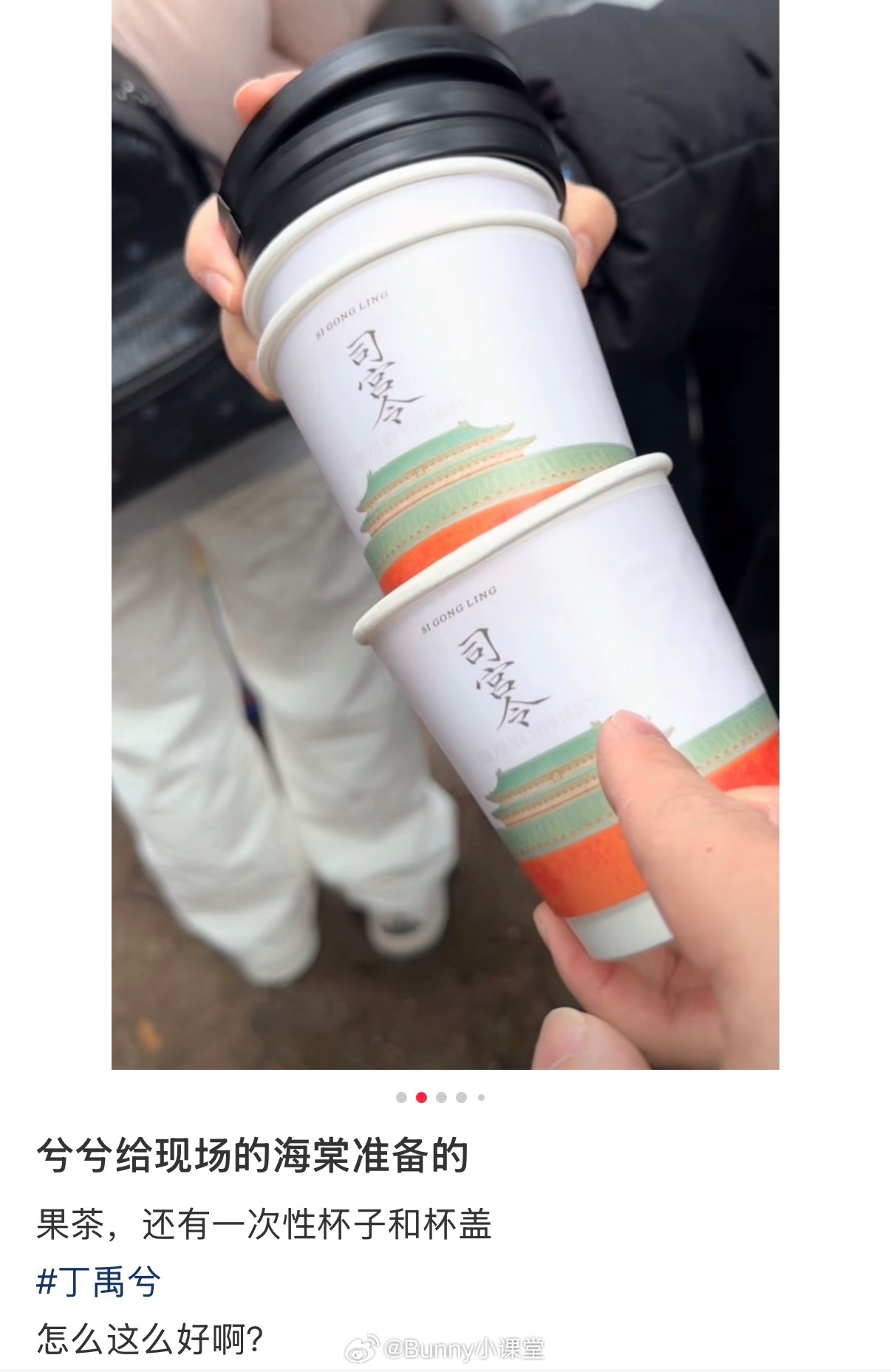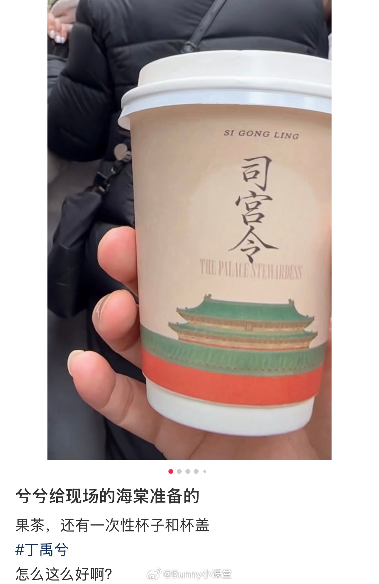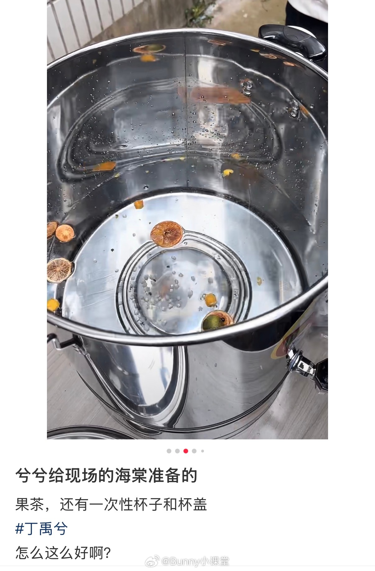 《司宫令》拍摄现场,丁禹兮给粉丝准备了果茶和一次性杯子,热水泡几片柠檬也算果茶吗