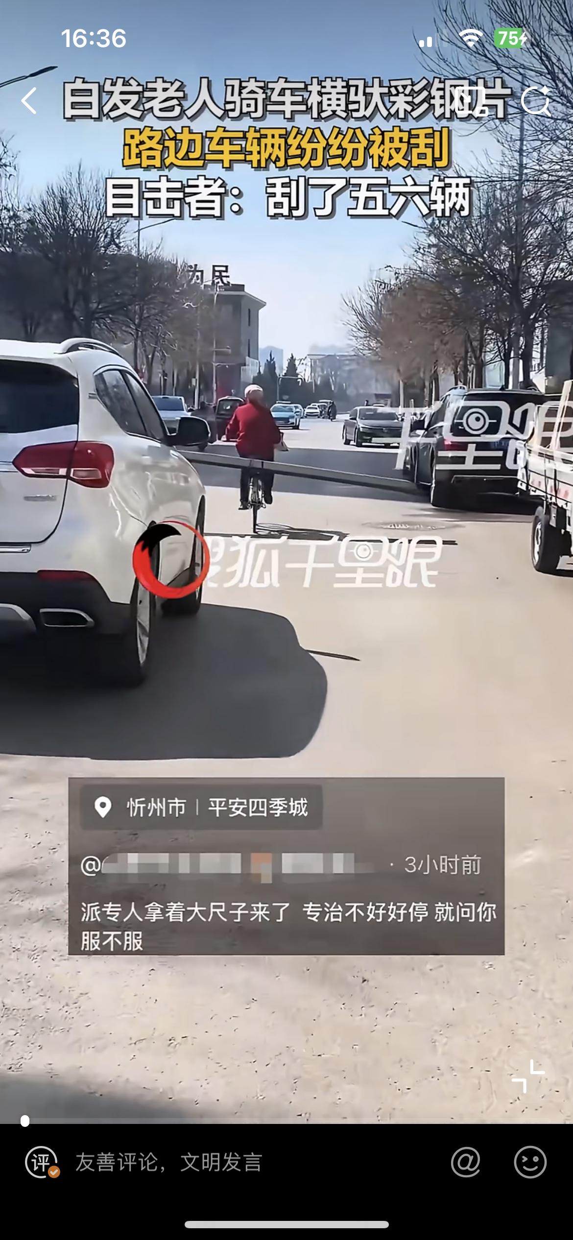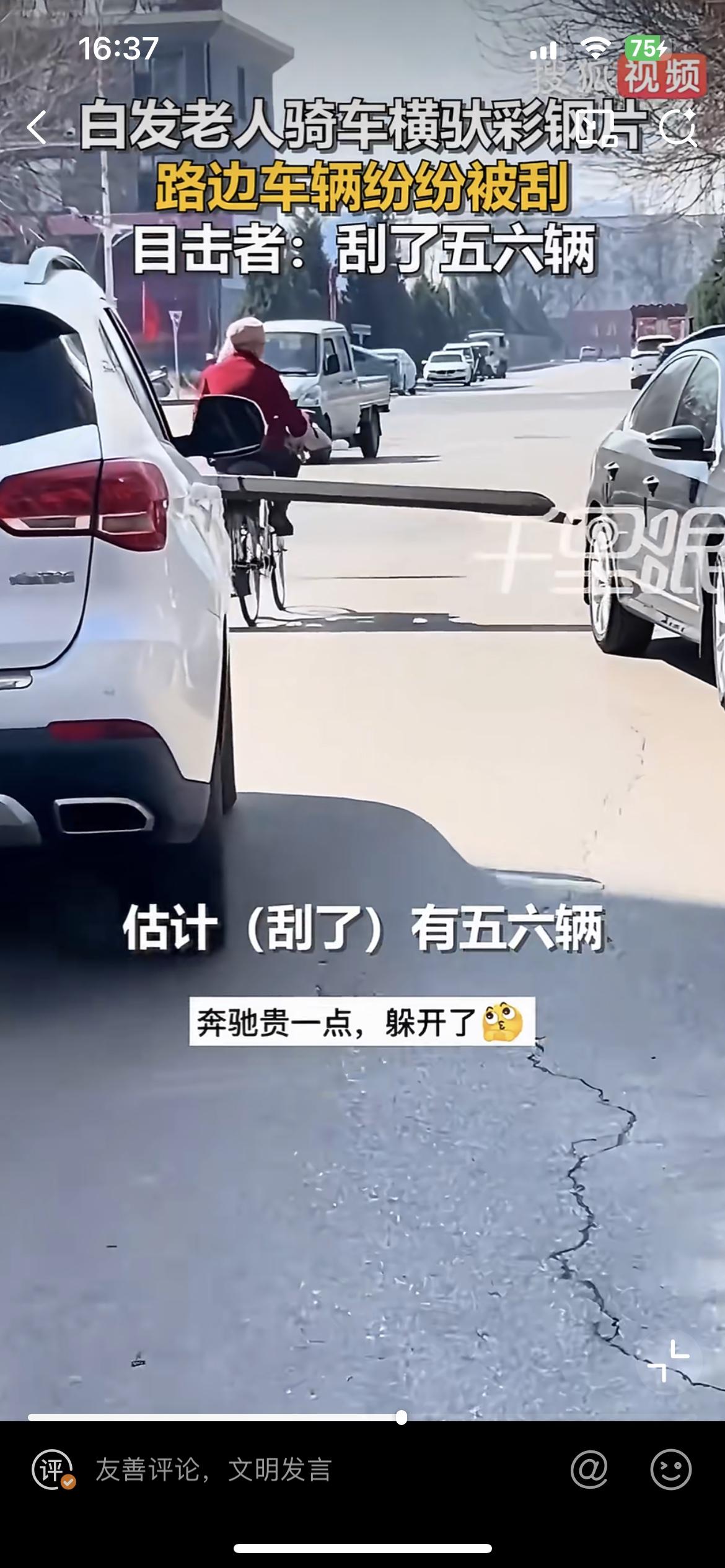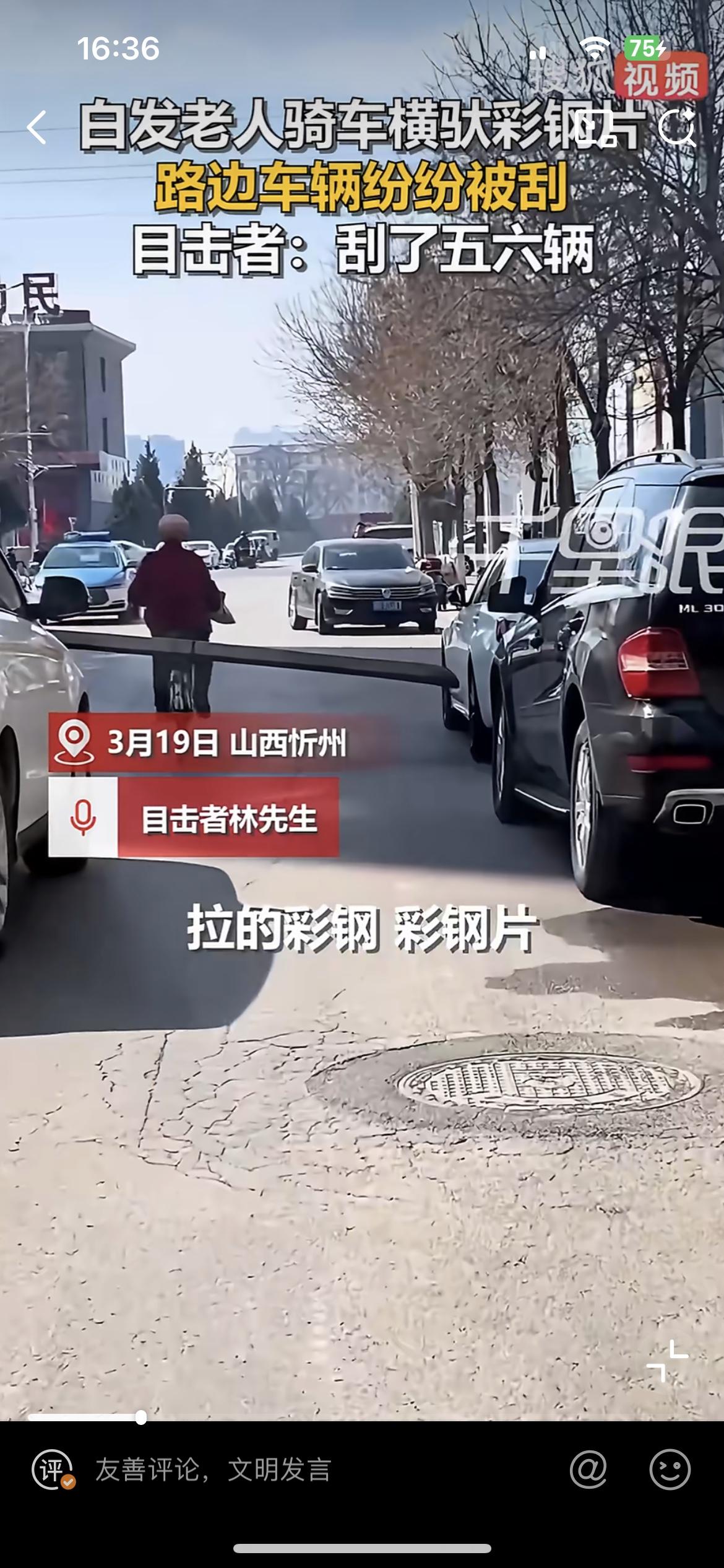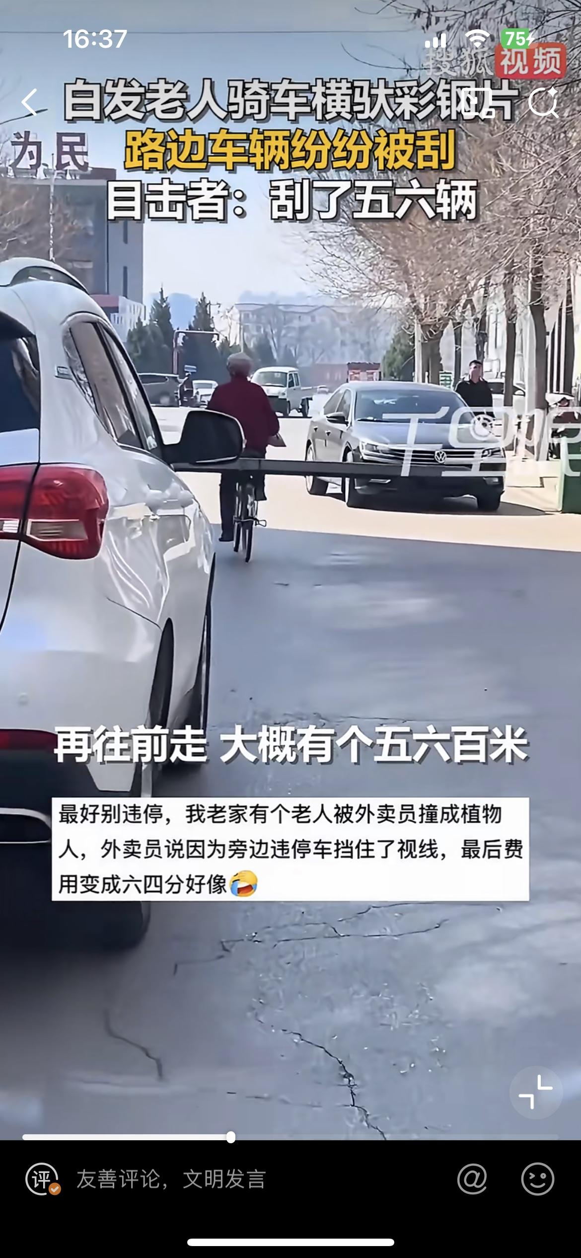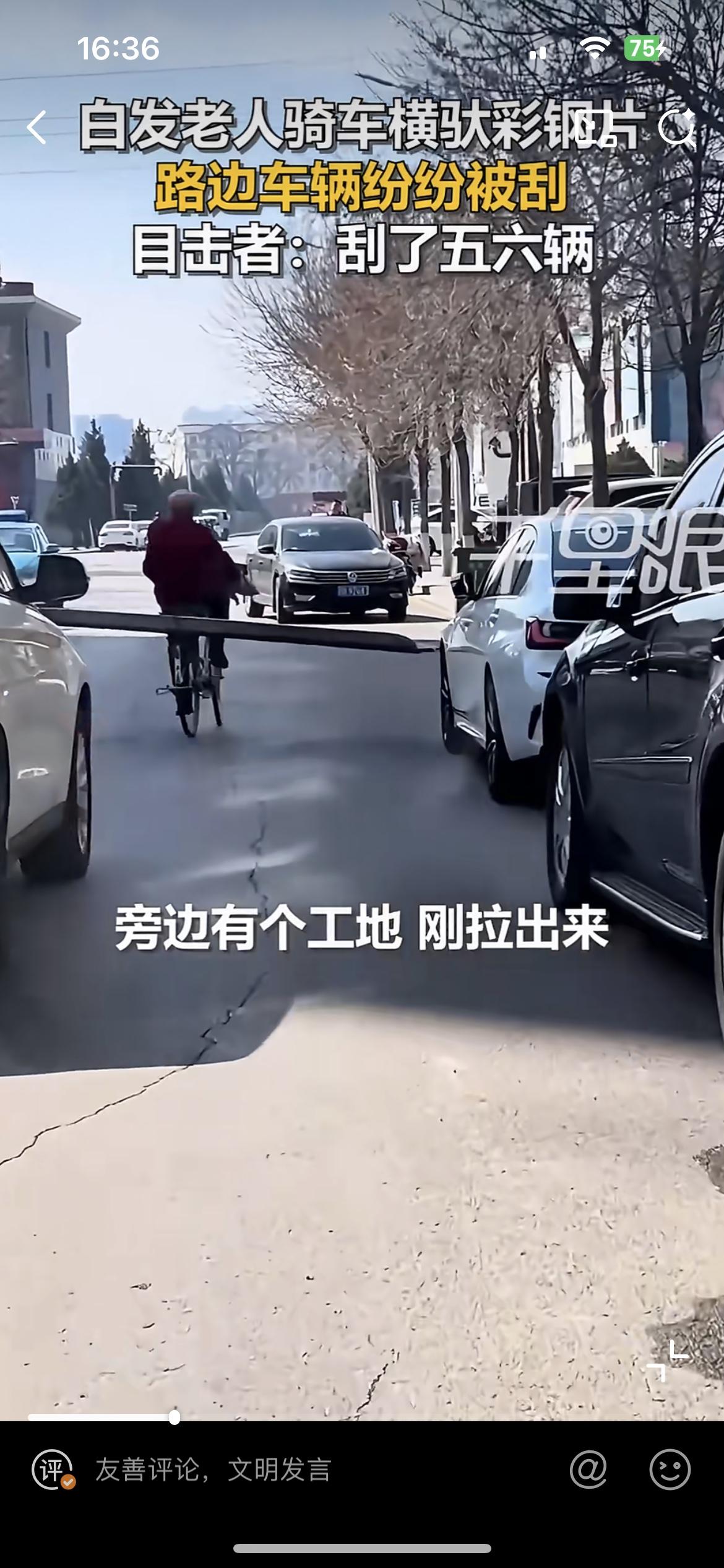 山西忻州一老人骑自行车横驮彩钢片,连刮五六辆车,这样没有安全意识的老人,该怎么说好呢?骑车不管不顾,一条长长的彩钢片把整条马路都给占满了,骑车左右摇晃,不停的刮擦到路边的汽车,刮出长长的痕迹,车主找到他,估计会装无辜,找他赔偿那更不可能。但是反过来,要是他被这些停着的车刮倒了,肯定会找这些车主索赔。