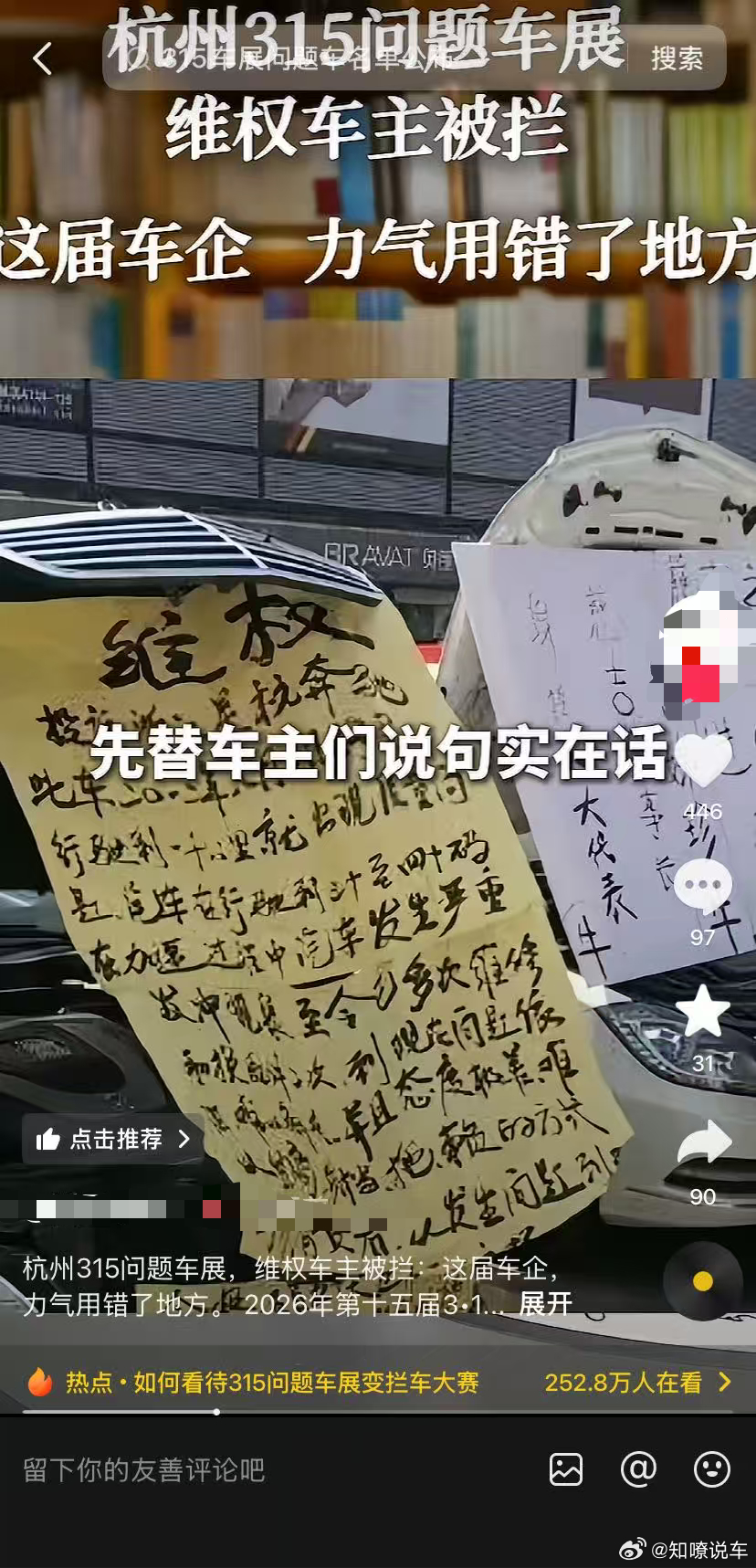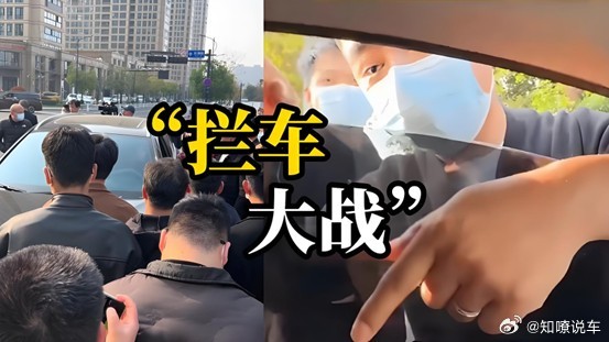 车展开幕前一夜,不少品牌的经销商和公关就已经蹲在入口守着,等着拦自己家的问题车。杭州现场,有的品牌工作人员不光拦车,还把脚伸到车轮底下不让走。还有人戴着墨镜撑着黑伞,站高处拿手机瞭望放风,瞅见自家品牌的车就通过对讲机喊人拦截。这围追堵截的阵势,跟4S店里销售那副热情笑脸形成了鲜明对比。