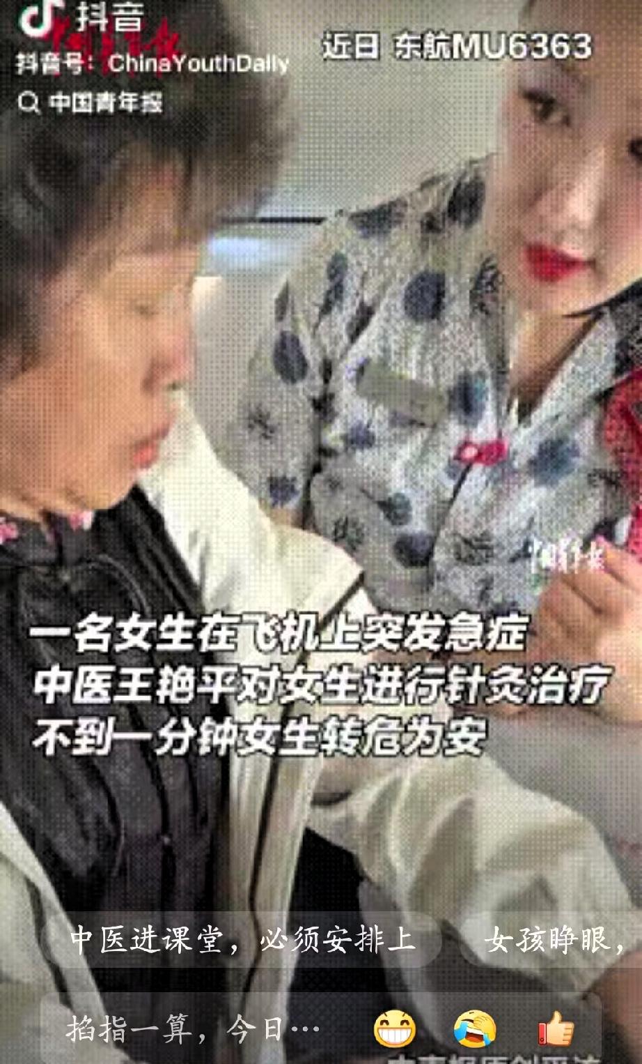 “太牛了!”东航万米高空上,女孩突发急症嘴唇发黑,此时,同机乘客王艳平主动站了出来。她是太原王氏针灸非遗传承人,也是一名执业中医师。出于职业习惯,她随身携带着针灸针,以备不时之需,用她的话说,就是“不带钱也要带针”。 在简单判断情况后,她为患者诊脉,确认生命体征尚平稳,随即采取急救措施,对相关穴位进行点按与针刺。整个过程不到一分钟,女孩的状态明显好转,意识逐渐恢复,嘴唇颜色也慢慢恢复正常。 在后续飞行中,王艳平一直守在女孩身边观察情况,直到航班落地,将患者妥善交接给地面医护人员后才离开。整个过程冷静、专业、稳妥。 这件事被乘客记录下来发到网上,很快引发大量关注。很多网友表示,这才是真正的医者仁心,不张扬、不犹豫,在别人需要的时候挺身而出。 也有不少人借此重新认识中医。很多人印象里,中医多用于调理身体,而这次高空急救,让大家看到传统医学在急症处理中同样具备实用价值,是老祖宗留下的宝贵经验。 在公共场合、突发状况下,敢出手、能出手、不出错,既需要过硬的专业能力,也需要一份责任与担当。王艳平没有因为环境特殊、责任风险而退缩,也没有因为事不关己而选择旁观,用最朴素的行动,完成了一次温暖又有力的救助。 平凡的人,做着不平凡的事。一根银针,一份仁心,一次伸手,既守护了生命,也让更多人看到中医的价值与医者的温度。 这样踏实、善良、有本事的普通人,最值得我们尊重与点赞。