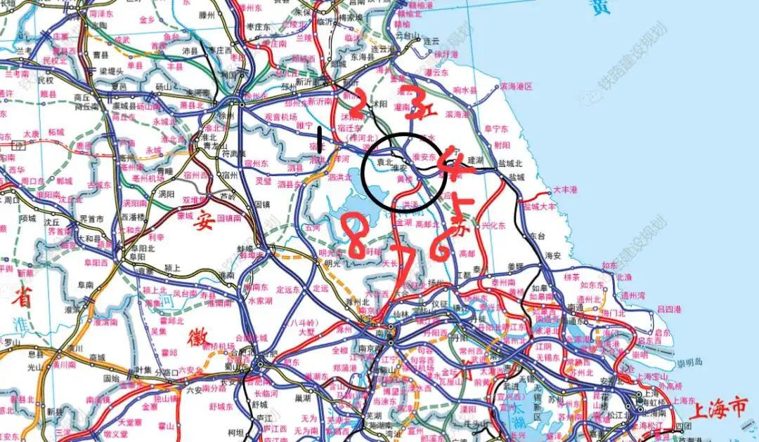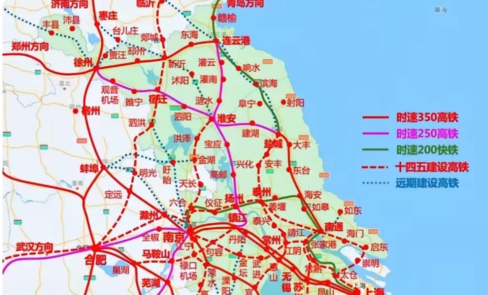 淮安:从“铁路末端”到“苏北枢纽” 普铁时代,位于苏北的淮安市一座不知名的城市,如今在高铁时代淮安正规划形成一个衔接多个方向的放射型铁路枢纽。该枢纽将衔接连云港、新沂、徐州、宿州、南京、镇江、盐城、泰州等8个方向,逐渐成为苏北不折不扣的铁路枢纽。 1.普速铁路 新长铁路,是连接江苏省徐州市新沂市和浙江省湖州市长兴县的客货共线国铁Ⅰ级单线,贯穿江苏南北; 宿淮铁路,是连接安徽宿州与江苏淮安的国铁Ⅰ级单线铁路,全长210公里,以货运为主、客运为辅。 2.高速铁路 已形成五向高铁枢纽,宁淮高铁将苏北与南京紧密相连,未来三条规划线路将助力其跻身全国综合交通枢纽。 目前开通的有徐盐(徐州至盐城)高铁、连镇(连云港至镇江)高铁设计速度均为250km/h, 连镇高铁与徐盐高铁刚好相交于淮安,淮安的枢纽地位已显现。 宁淮(南京至淮安)高铁等高速铁路设计速度均为350km/h,预计会在2027年同南京北站一同建成通车。 3.规划项目 淮新高铁是一条连接淮安与新沂的高铁线路,十四五”初期就已推进中,只是后来因潍宿高铁的规划建设,而被搁浅,但对于这条高铁的建设,民间的呼声是相当高的。 淮兴泰高铁是一条连接淮安与泰州的高铁线路,途经兴化,这条高铁目前信息是较少的,正在推进中。 沿淮高铁东接连淮扬镇铁路,串联信阳、阜阳、蚌埠、淮安等城市,横跨河南省南部、皖北和苏北地区。