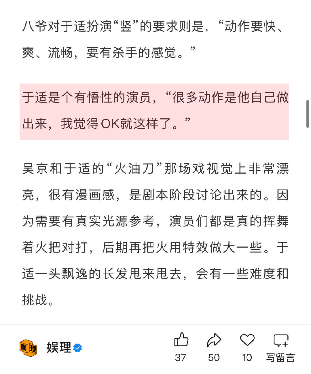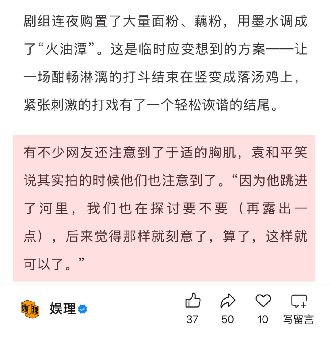 袁和平说镖人续集还可以拍 袁和平谈没让于适露胸肌 《镖人》上映之后,有不少网友还注意到了于适的胸肌,袁和平笑说其实拍的时候他们也注意到了。“因为他跳进了河里,我们也在探讨要不要(再露出一点),后来觉得那样就刻意了,算了,这样就可以了。” “火油刀对打”是剧本阶段讨论出来的,于适一头飘逸的长发甩来甩去,会有一些难度和挑战。 娱理独家↓