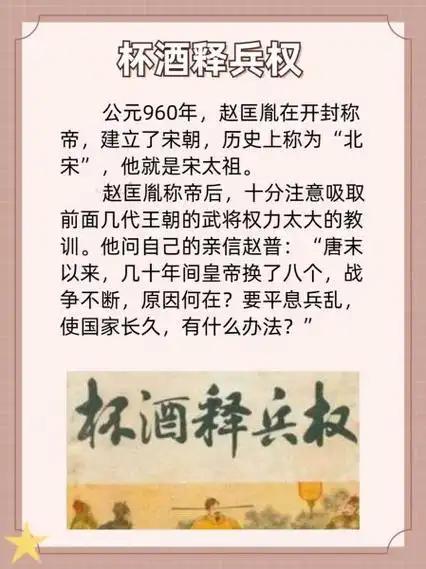 【杯酒释兵权】——赵匡胤的帝王智慧 宋太祖赵匡胤深知武将掌握兵权是国家隐患,担心他们心怀不轨,威胁皇权稳定。于是,他巧妙地运用政治智慧,摆下酒席,邀请众多武将共聚一堂。在酒席上,他以诚恳而又含蓄的话语说道:“你们何不将兵权交还朝廷,安心回家享受天伦之乐?”这番话既没有强硬命令的威压,也没有直接的威胁,却让众多武将心甘情愿地放下兵权。 这一场“杯酒释兵权”的故事,展现了赵匡胤非凡的帝王心术。他没有像其他历史君主那样通过屠杀功臣来巩固权力,而是选择了更为高明的和平手段。通过智慧和策略,他成功地化解了潜在的权力危机,稳固了宋朝的统治基础。 这一段历史不仅体现了赵匡胤的政治远见,更为后世提供了宝贵的治国经验:真正的权力斗争,不仅仅靠武力,更靠智慧与谋略。杯酒释兵权,成为中国古代政治智慧的经典范例,也提醒我们,和谐与信任往往比武力征服更能长久地维护稳定与和平。皇帝典故 历史权谋智慧 宋朝权谋 皇帝政治 历史 历史故事 历史冷知识 历史人物