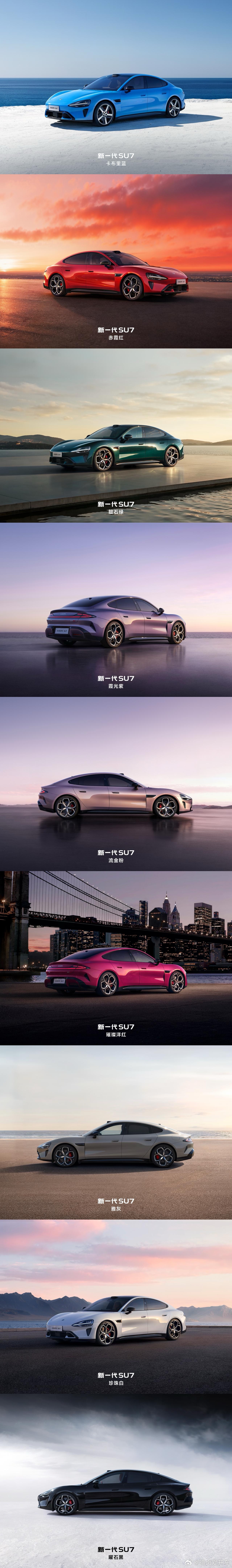新一代SU7推出9款车漆对应4大色系:跑车色系:卡布里蓝、赤霞红、璀璨洋红,时尚色系:雅灰、流金粉、霞光紫,豪华色系:靛石绿,经典色系:珍珠白、曜石黑;大家觉得哪一个颜色更好看?小米新一代SU7今日发布
