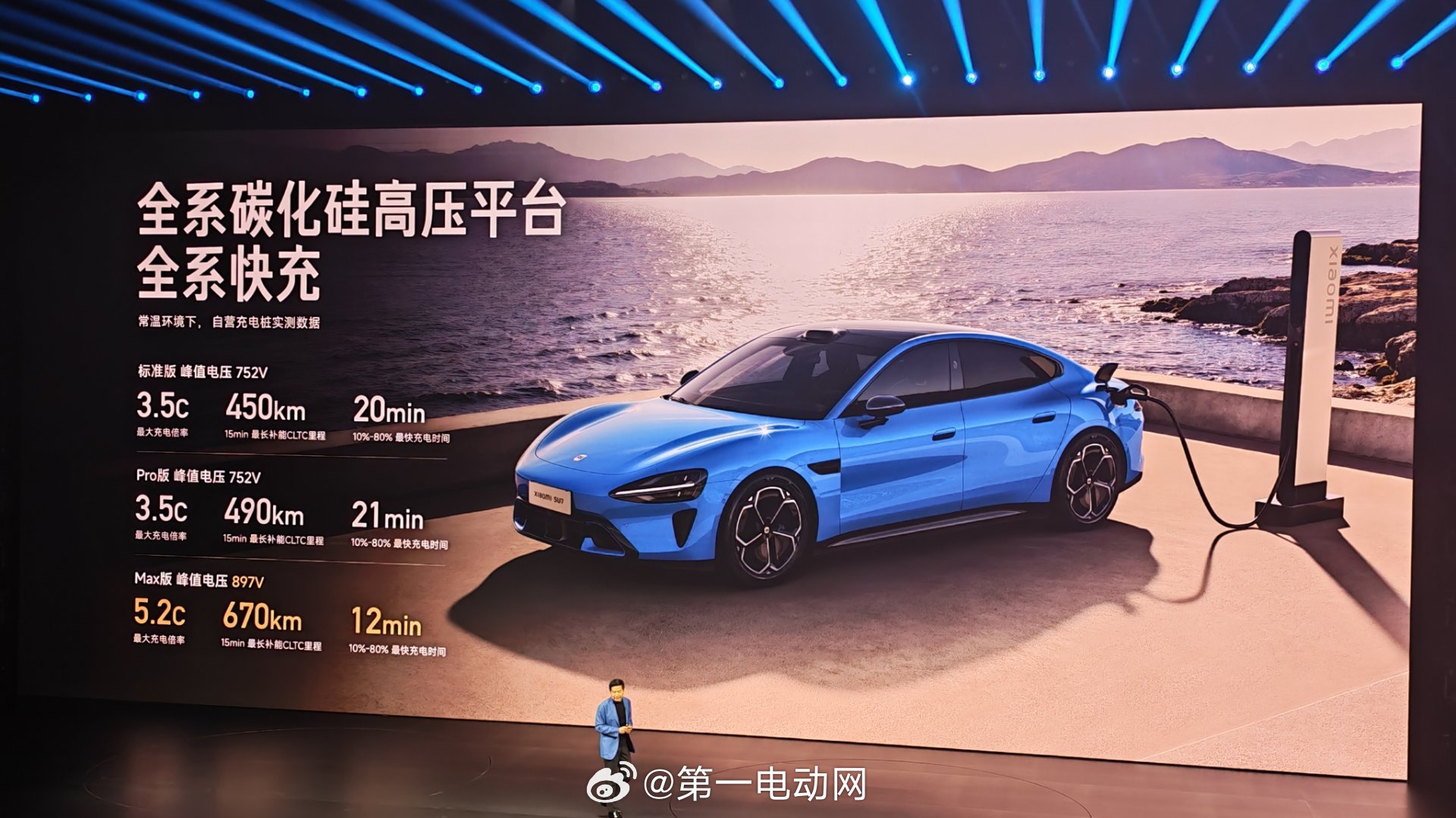 新一代SU7 更好开,全系搭载V6s Plus 超级电机,Max版零百加速3.08s,最高时速265km/h;全系长续航|Pro版 CLTC续航902km,Max版CLTC续航835km,标准版CLTC续航720km ;全系快充|全系碳化硅高压平台,Max版最大充电倍率5.2C,10%-80%最快充电时间12分钟。