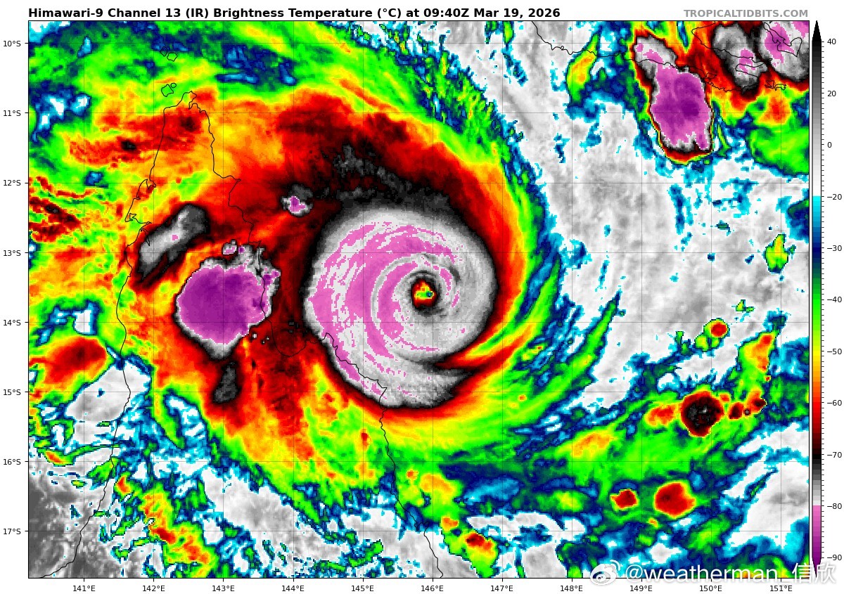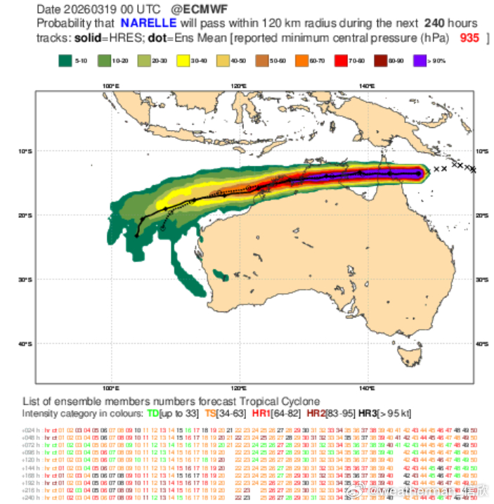 【五级强热带气旋“纳蕾勒”】目前在澳大利亚东北侧,有个很强的热带气旋,纳蕾勒(NARELLE),中心附近最大风速62米/秒,强度相当于我国标准的超强台风。未来纳蕾勒西行,将于20日凌晨至上午在澳大利亚昆士兰州东北部沿海登陆。之后还会在北领地的北部沿海再次登陆。甚至不排除还有第三次登陆。总之,会自东向西,横扫澳大利亚北部沿海地区。