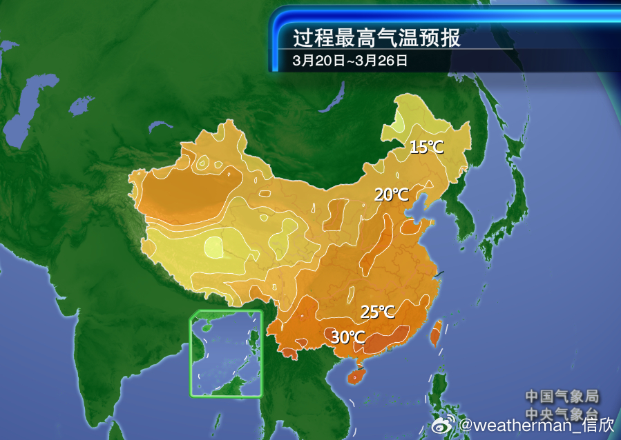 【气温震荡上升】未来冷空气势力减弱,尽管会带来一些降温,但无法阻挡气温上升的大趋势。我国大部分地区未来气温将高于常年同期,北方多地以及华南气温可能创今年以来新高。未来7天,最高气温20℃线最北可达辽宁,华南多地可能会看到30℃。