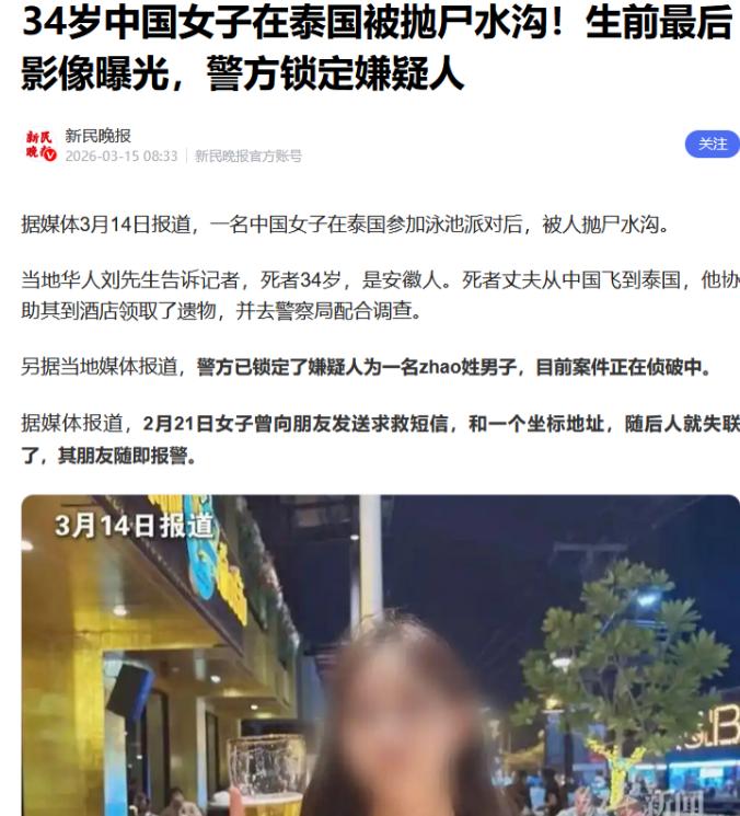 在泰国被抛尸水沟的34岁女子是安徽人,她的孩子才三岁多!出国两年多她每个月都会给丈夫转一笔不少的钱。终究没能活着回家,惨死异国后被抛尸荒郊臭水沟。 2月21号凌晨,季某给国内的一个朋友发了一条短信,就三个字:“救救我”,之后就彻底失去了联系。那个朋友急得不行,反复联系季某,都没有回应,只好赶紧联系季某的丈夫张某。 张某今年31岁,和季某在一起四年多,接到消息后,当天就从国内坐飞机赶到了泰国,第一时间报了警,生怕妻子出什么意外。 泰国警方介入调查后,很快就查到了季某失踪前的行踪。原来,季某在泰国芭提雅定居,事发前,她接了一份工作,去当地一处泳池别墅里当派对娱乐人员,当时别墅里有不少中国籍男子参加派对。 警方调取了别墅的监控,画面看得清清楚楚,季某在派对期间,大部分时间都和一名中国男子待在一起。 监控里最让人揪心的一幕,是派对结束后,那名中国男子趁着季某昏迷,从后面抱着她,硬生生把她拖拽出别墅,然后塞进了一辆黑色的宝马车里,开车离开了。 警方顺着宝马车的轨迹追查,发现这辆车从春武里府一路开到了叻丕府,车主说,车子是被一个中国朋友借走的,一天后就还了回来,至于借车人做了什么,他一无所知。 2月25号下午,叻丕府的村民在一片椰子园的排水沟里,发现了一具女尸。尸体被发现时,上身赤裸,只穿了一条白色短裤,面朝下漂浮在沟边,已经开始腐烂,初步判断死亡时间有四五天,和季某失踪的时间刚好对得上。 警方把尸体送去法医鉴定,最终确认,这具尸体就是失踪多日的季某。 这个排水沟地处偏僻,周边全是杂草,平时很少有人去,要是村民没发现,季某可能就永远埋骨异国,连亲人都找不到她。 当地有个华人刘先生,得知季某是安徽老乡,主动帮忙,陪着季某的丈夫去酒店领取遗物,还一起去警察局配合调查,帮着提供线索。 随着调查深入,警方锁定了嫌疑人,是一名29岁的中国籍男子,叫赵天星(音译),就是监控里拖拽季某上车的那个人。 3月13号,泰国警方已经对赵天星发出了逮捕令,指控他非法拘禁致人死亡,还转移、藏匿尸体。 日前,一段季某朋友和赵天星的对话音频被曝光了。音频里,季某的朋友问赵天星,季某是不是找过他,赵天星承认了。 可当被问到,是不是他最后一个和季某在一起时,他却推脱说,当时喝醉了,什么都记不清。这话实在让人无法信服,监控明明白白拍着是他把昏迷的季某拖走的,现在却说记不清,明摆着是在逃避责任。 直到现在,季某的具体死因还没确定。法医还在做详细尸检,到底是被人殴打致死、被下药害死,还是和毒品有关,目前都没有定论。 季某的丈夫张某,在泰国一边等着尸检结果,一边盼着警方能尽快抓住赵天星,查清真相。他说,他坚信妻子不是自然死亡,这里面肯定有隐情,一定要为妻子讨回公道。 想想季某这一辈子,才34岁,正是上有老下有小的年纪。为了家庭,为了三岁多的孩子,她远离家乡,在异国他乡辛苦打拼,每个月省吃俭用,把钱都寄回家里,自己却在外面受着苦。 她以为只要努力,就能让家人过上好日子,就能早点回家和孩子团聚,可她怎么也想不到,自己会以这样惨烈的方式离开。 最可怜的就是那个三岁多的孩子,还不懂什么是死亡,只会天天问爸爸,妈妈什么时候回来。 他不知道,那个总给他寄好吃的、总在电话里喊他宝贝的妈妈,再也回不来了;他不知道,自己再也得不到妈妈的拥抱,再也听不到妈妈的叮嘱了。 这起案件里,还有太多让人不解的地方。赵天星和季某到底是什么关系?他为什么要伤害季某,还要把尸体抛到两百多公里外的水沟里? 他说的喝醉记不清,到底是真的,还是故意隐瞒?这些疑问,都等着泰国警方尽快给出答案。 季某的悲剧,也给所有在异国他乡打拼的人提了个醒,出门在外,一定要保护好自己,不要轻易相信陌生人,更不要去一些不安全的场合。 尤其是独自在外的女性,凡事多留个心眼,别让一时的疏忽,酿成无法挽回的悲剧。 希望警方能尽快抓获嫌疑人赵天星,查清所有真相,还季某一个公道,也让她的家人能得到一丝慰藉。更希望季某在天有灵,能安息,愿她的孩子能健康长大,记得妈妈曾经拼尽全力爱过他。